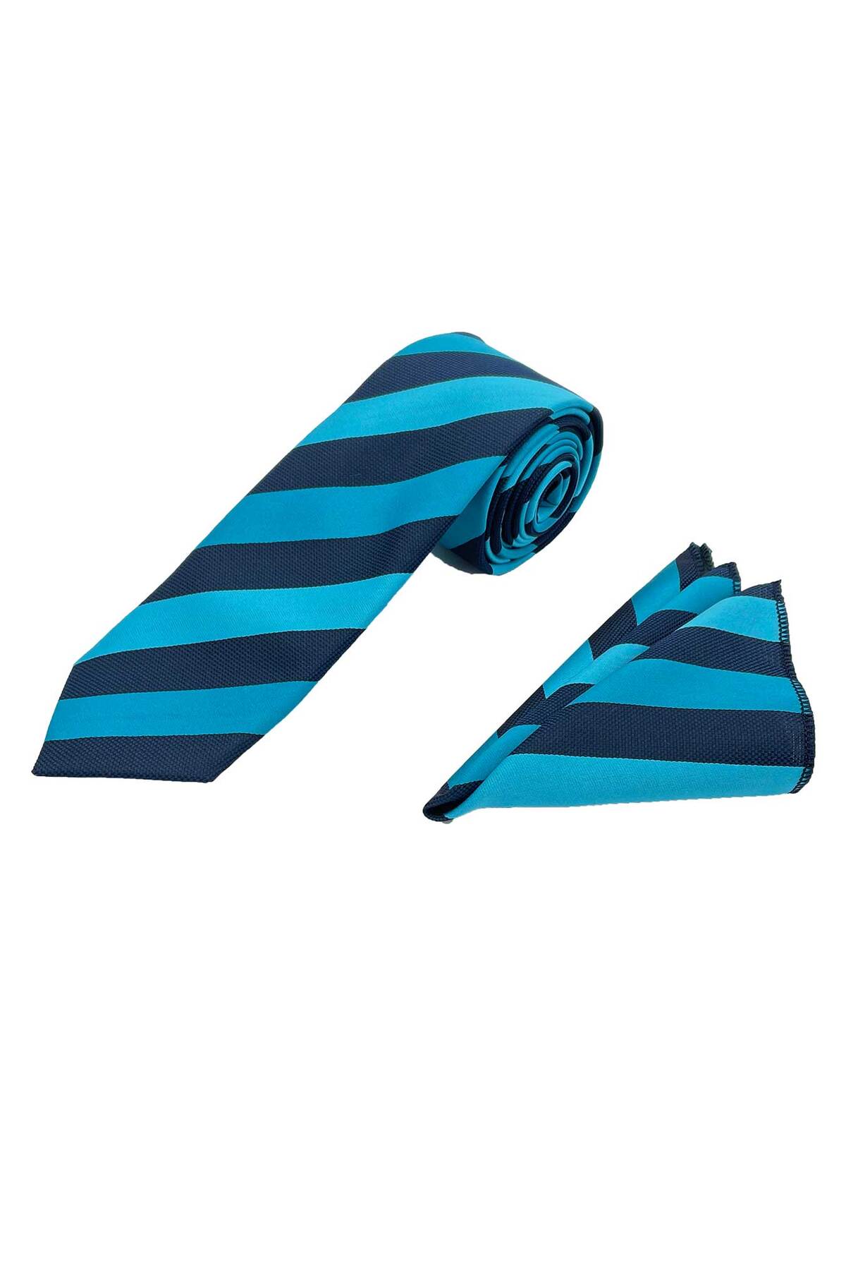 ست کراوات و دستمال راه راه آبی سرمه ای فیروزه ای مردانه راه راه | Brianze B00279
