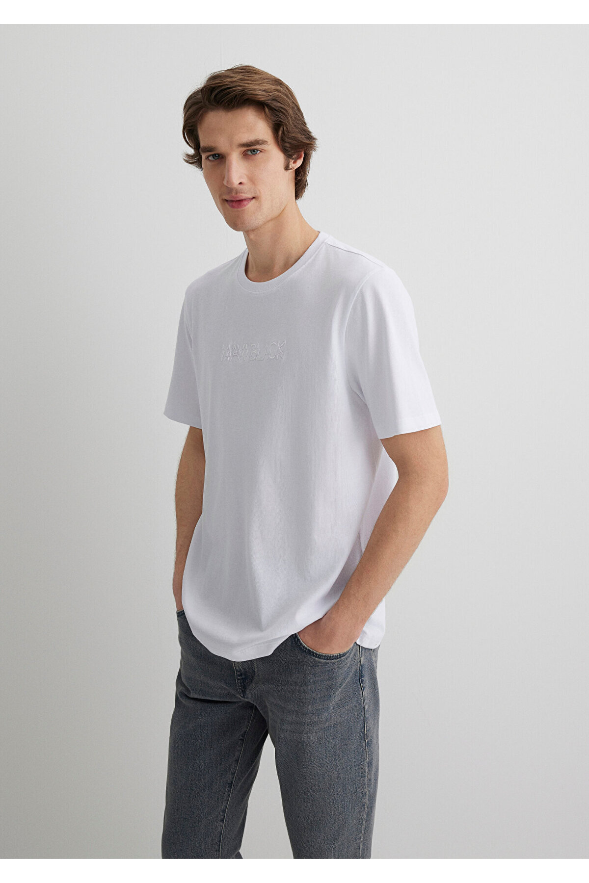 ماوی تی شرت پایه سفید دوزی مشکی با تناسب معمولی / برش معمولی 0612644-620