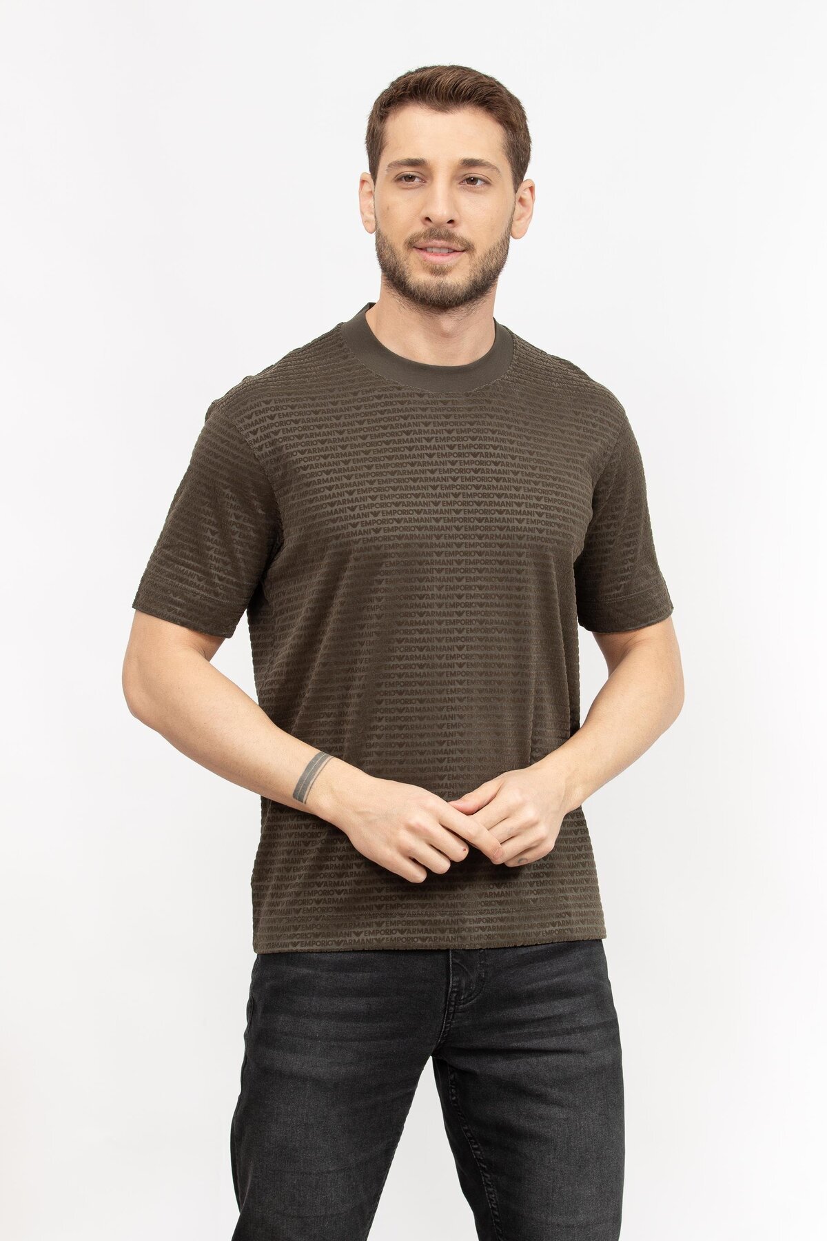 امپوریو آرمانی تی‌شرت مردانه یقه گرد نخی آستین کوتاه خاکی رنگ طرح لوگودار EM001288 AF10017-F8108