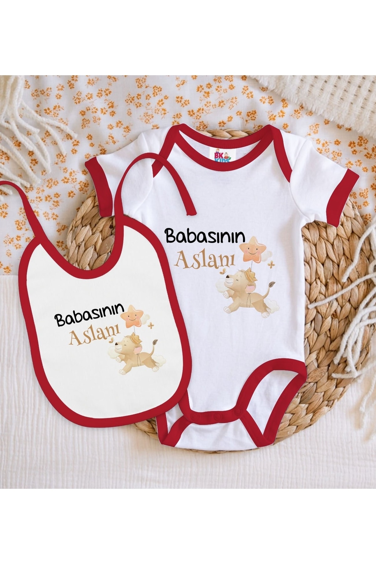 سرهمی و پیشبند نوزادی قرمز با طرح شیر بابا