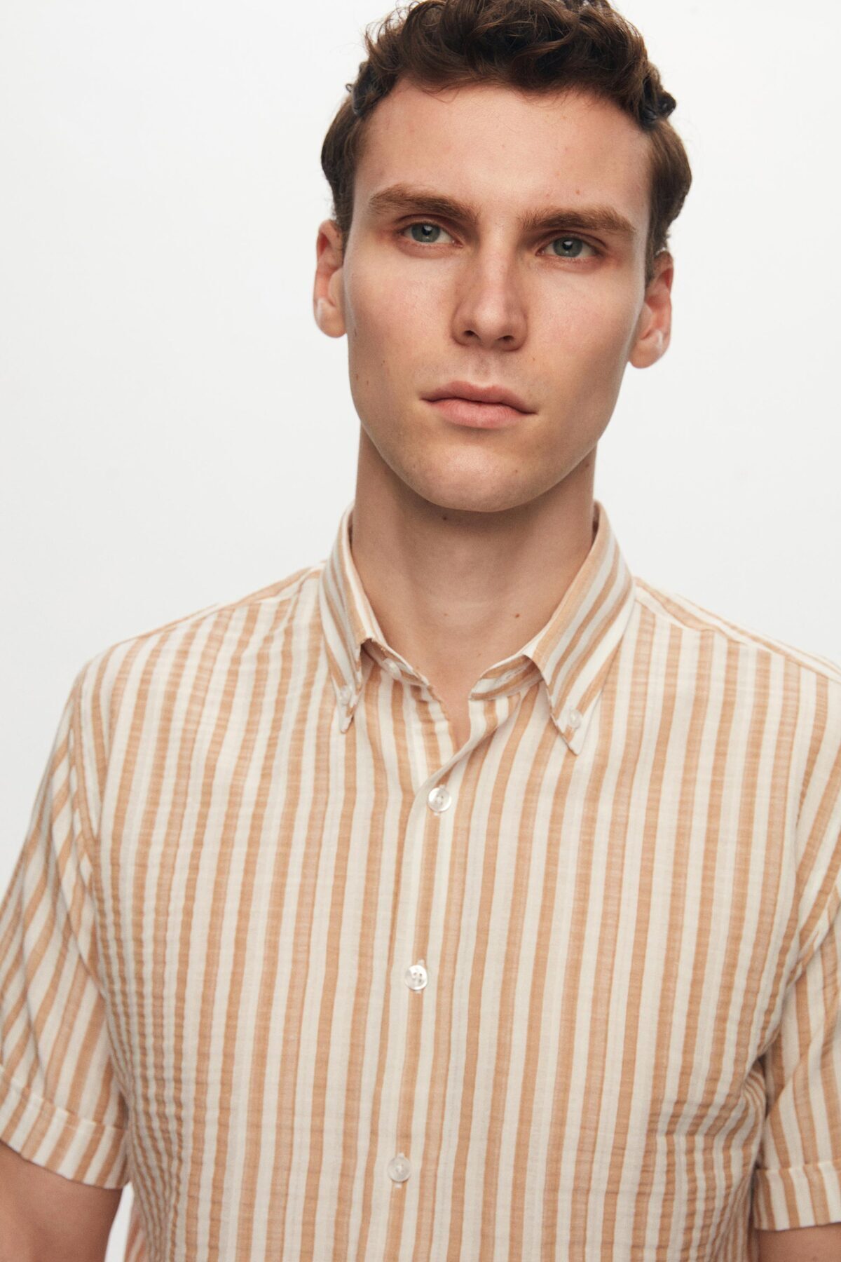 دی اس دامات پیراهن تابستانی آستین کوتاه راه راه بژ سیرساکر مدل اسلیم فیت دی اس دامات