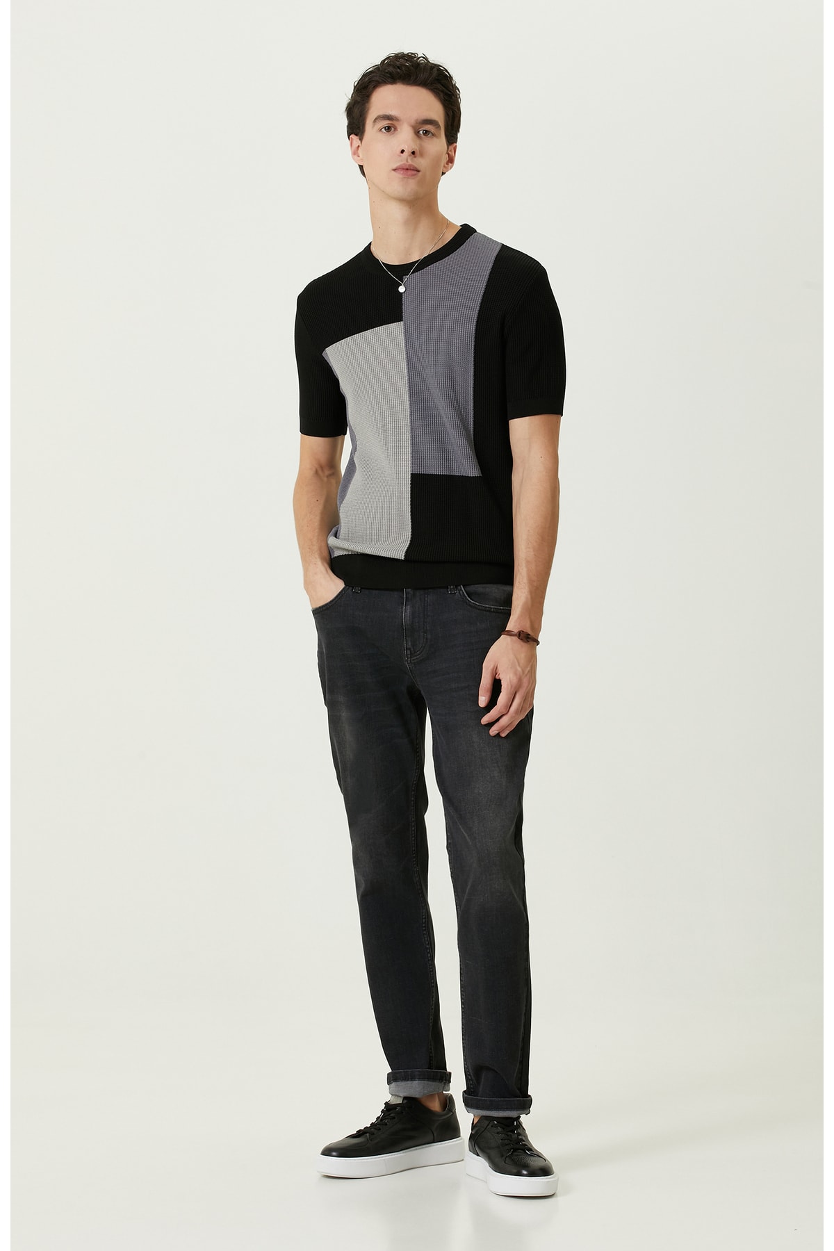نتورک ژاکت بافتنی یقه گرد آستین کوتاه مشکی بلوکی