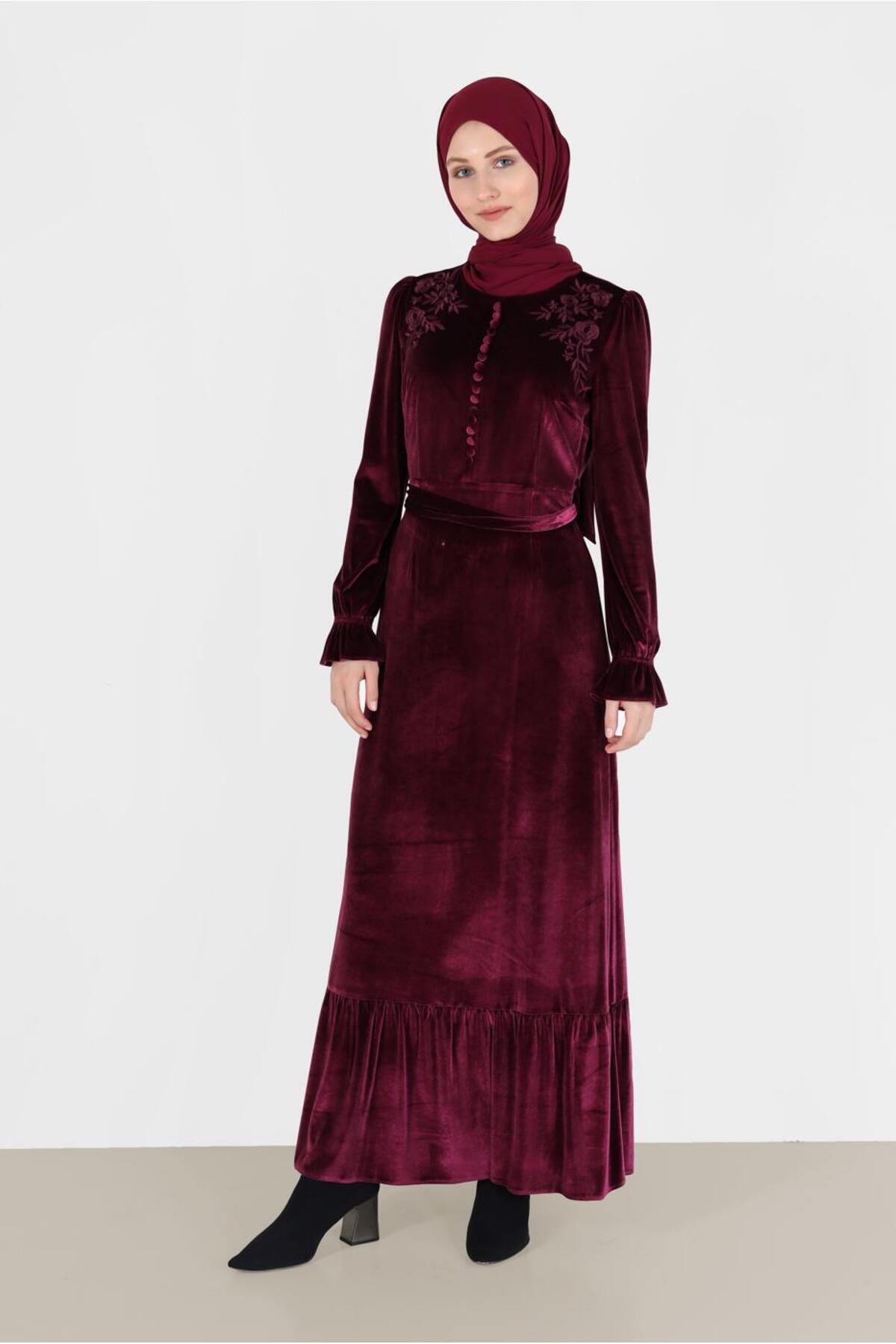 آلوینا لباس کمربند دکمه ای مخفی 42387 گلدوزی