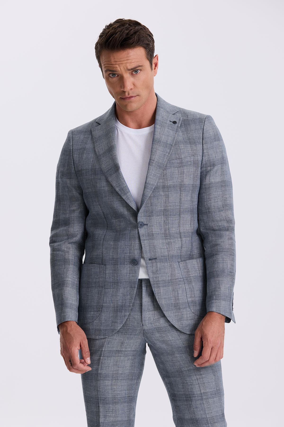 جاکامن کت و شلوار جیبی 100% کتانی با یقه تک یقه ای باریک آبی دریایی