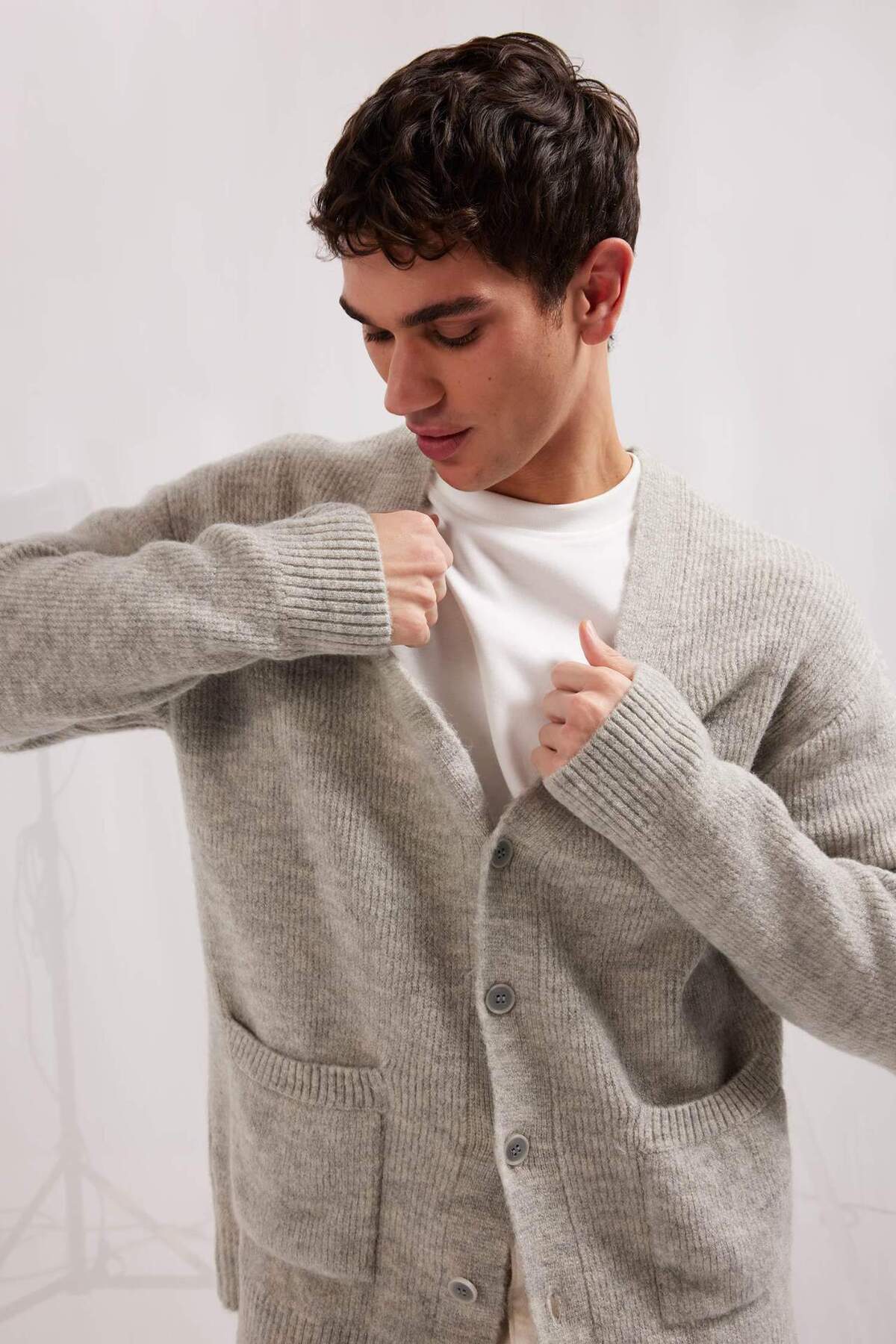دفاکتو ژاکت بافتنی ساده جیبی ساده Relax Fit V-Neck Basic E8392AX24CW