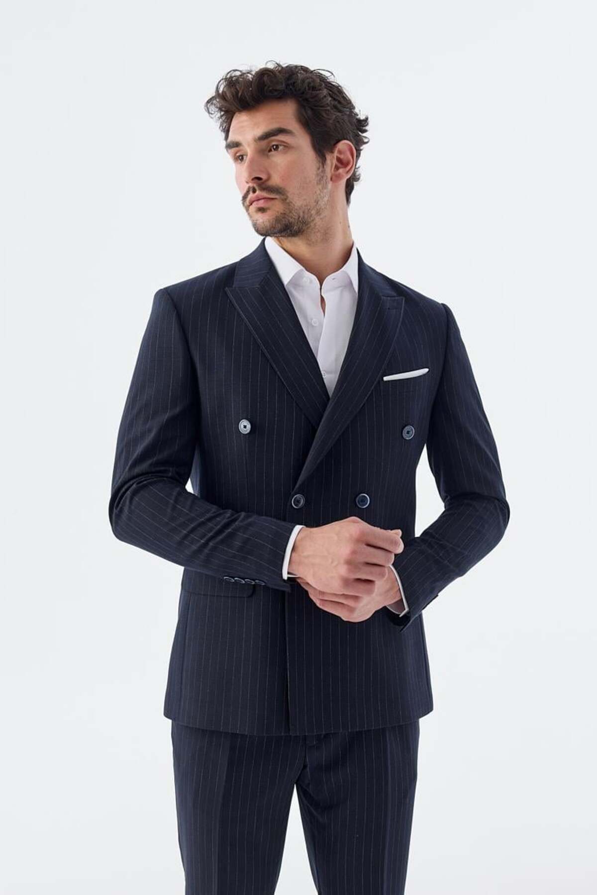 جاکامن کت و شلوار دو سینه راه راه باریک آبی نای