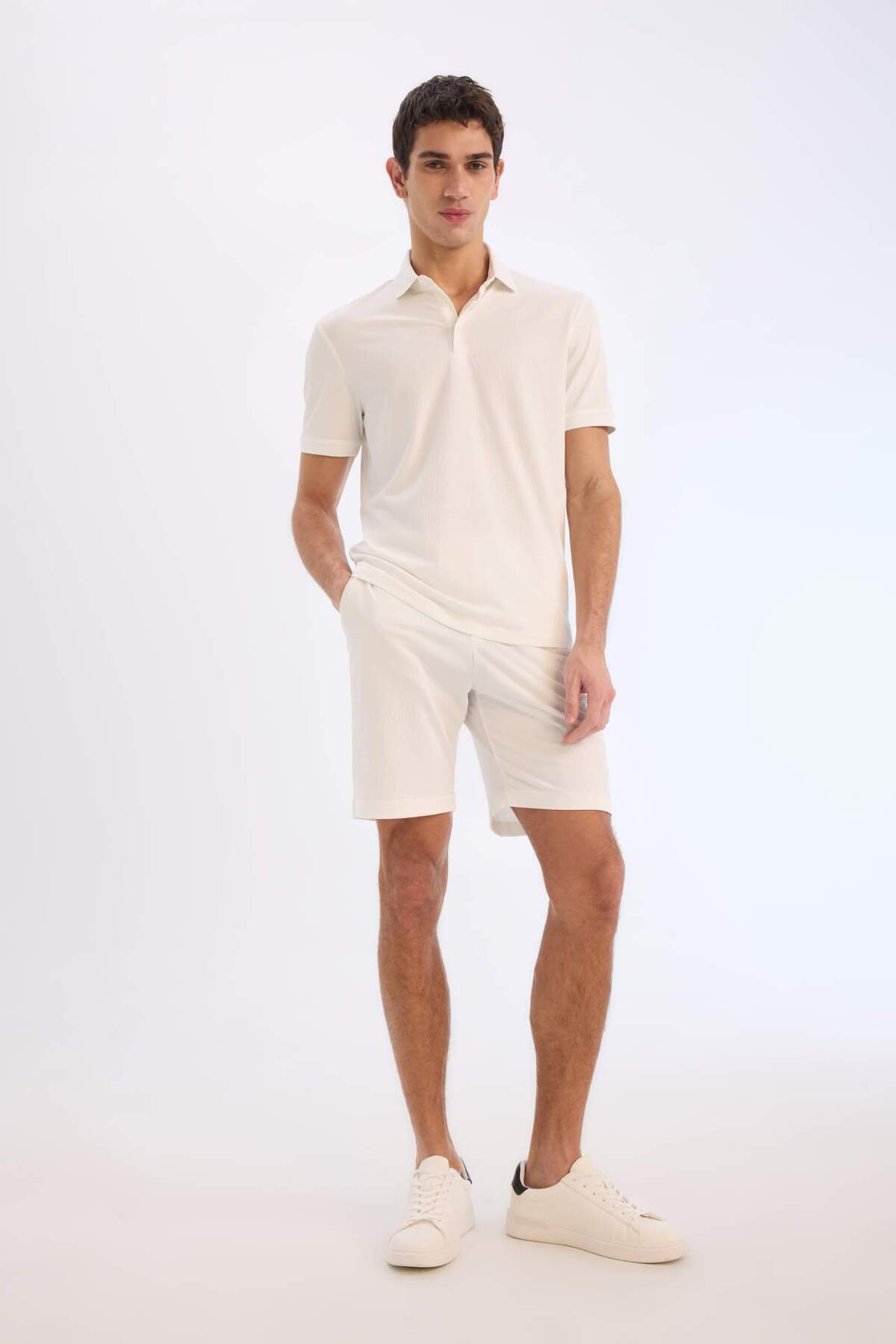 دفاکتو تی شرت اسلیم فیت اسلیم یقه چوگان با آستین کوتاه بافت دار تی شرت سفید E1222AX25SM