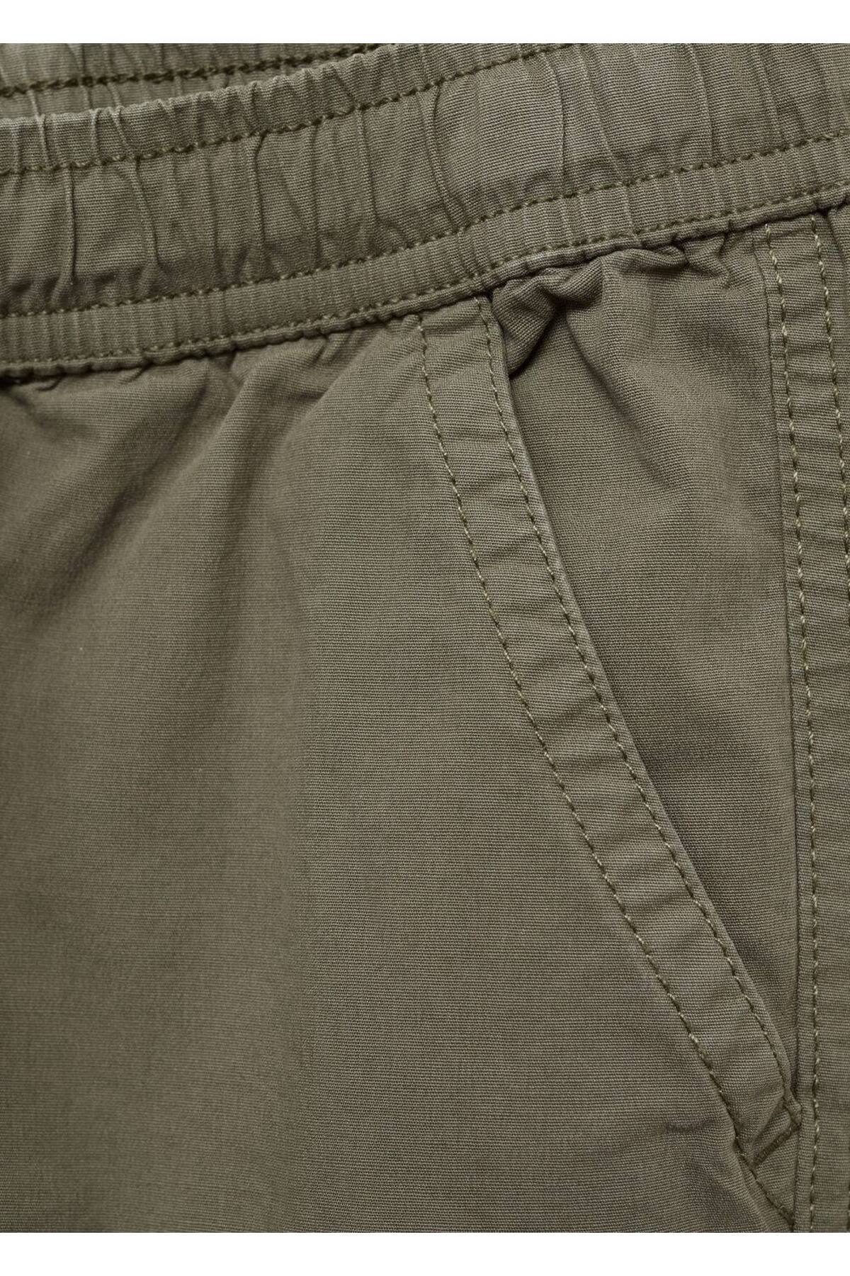 پارچه ۱۰۰٪ پنبه، پارچه کشی، طرح راسته، طرح بلند، کمر کشی بنددار، دو جیب کناری، دو جیب وصلهای در پشت، لبههای برگشته.