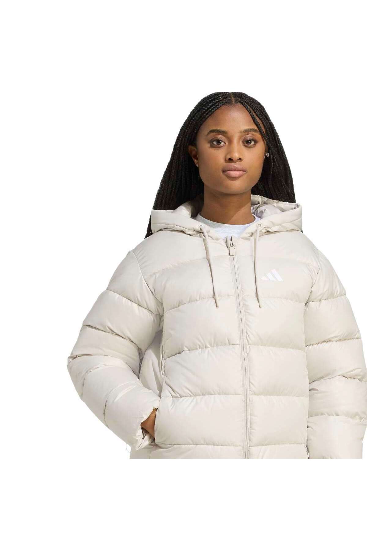 خرید اینترنتی کاپشن پر زنانه کلاه دار بژ رنگ Essentials از جنس الیاف مصنوعی برند آدیداس adidas اورجینال از Sporthink نمایندگی و فروشگاه معتبر ترکیه