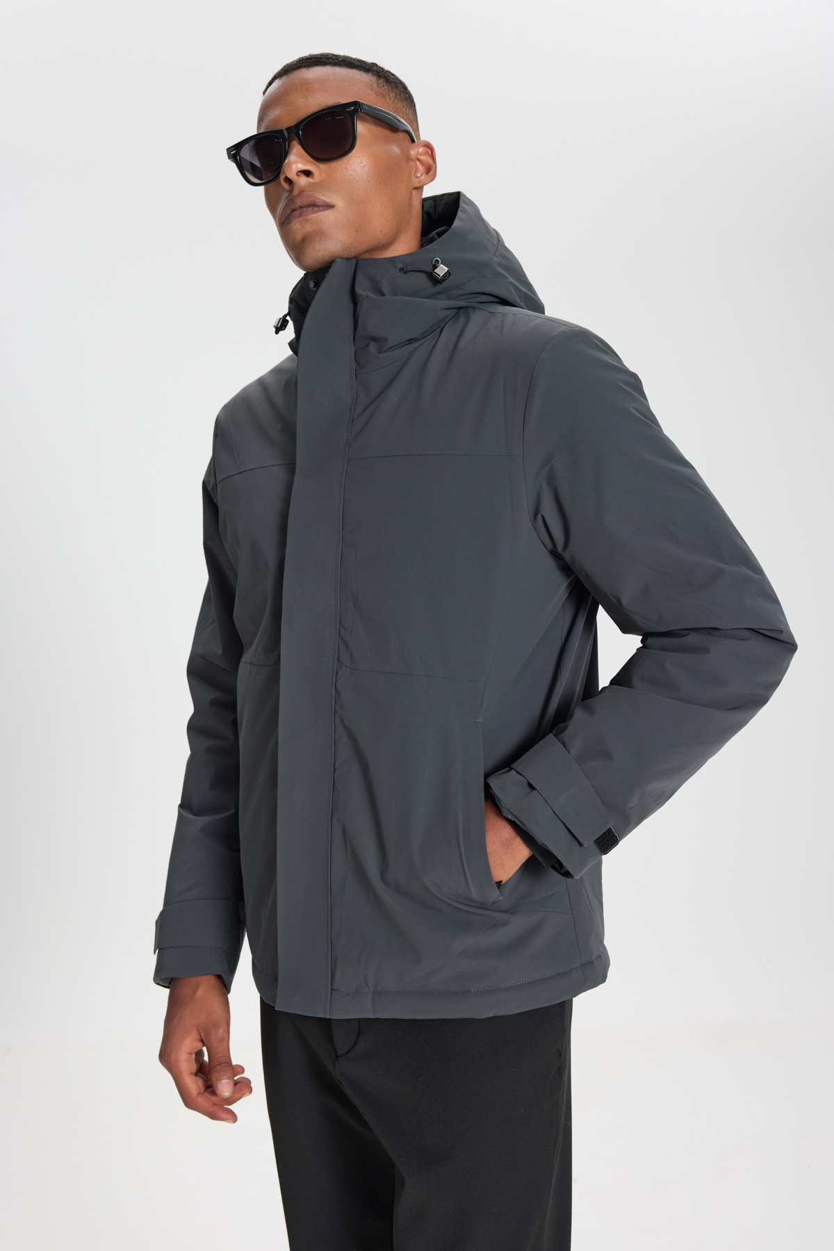 100% پلی استر، خاکستری، تناسب استاندارد، یقه کلاهدار ثابت، آستین بلند، زیپ دار، جیب های کناری، مجموعه زمستانی، Altınyıldız Classics Limited Edition Standard Fit ژاکت زیپ دار پوسته نرم کلاهدار برش معمولی با جیب های کناری.