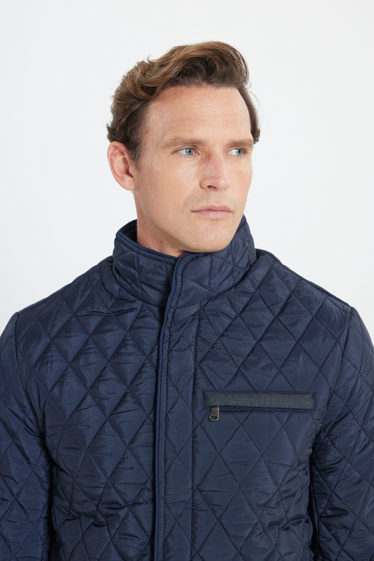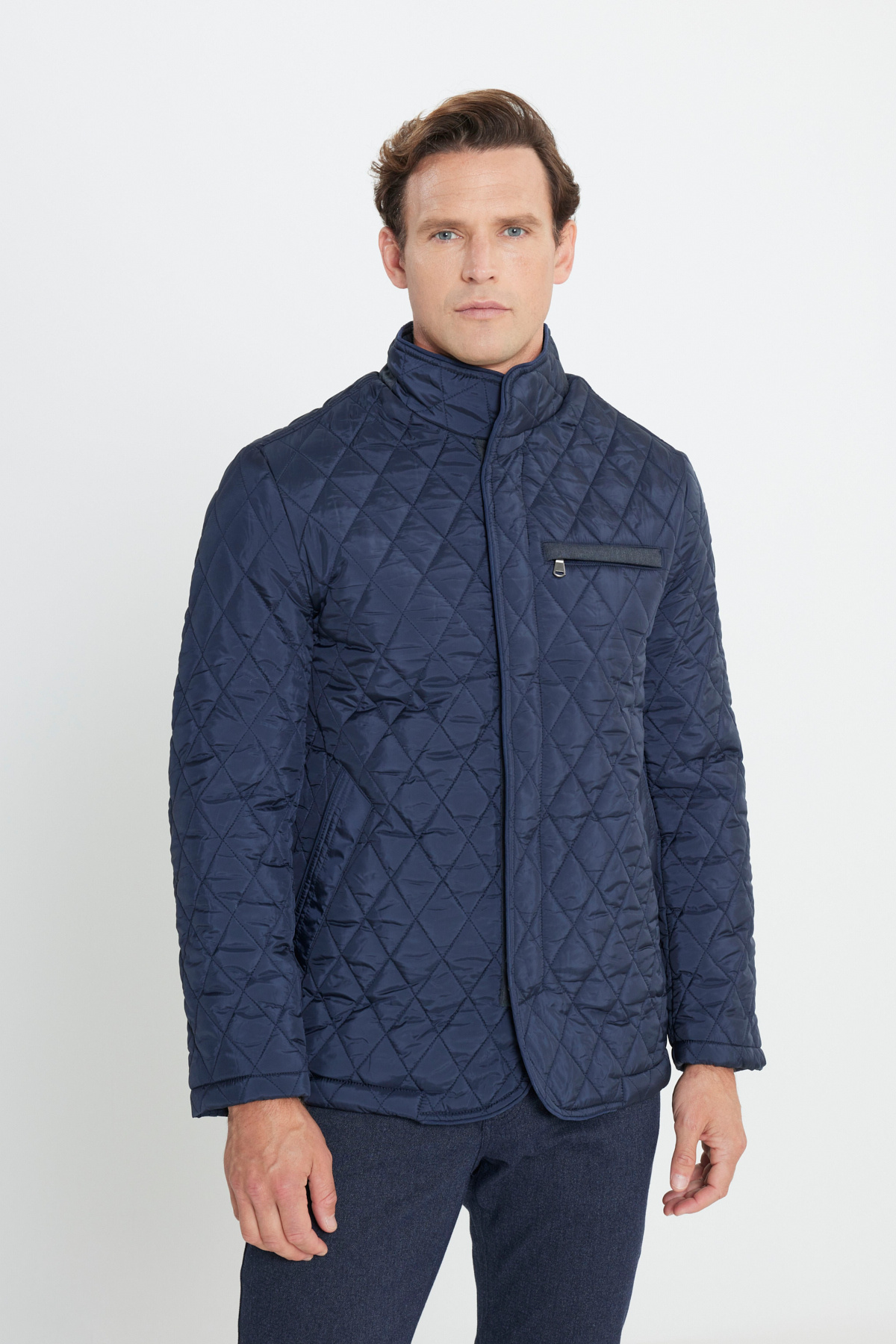 100% پلی استر، آبی سرمه ای لحاف، تناسب استاندارد، یقه ایستاده، آستین بلند، جیب های کناری، مجموعه زمستانی، کت طرح دار یقه پایه برش معمولی کلاسیک Altınyıldız، اطلاعات مدل