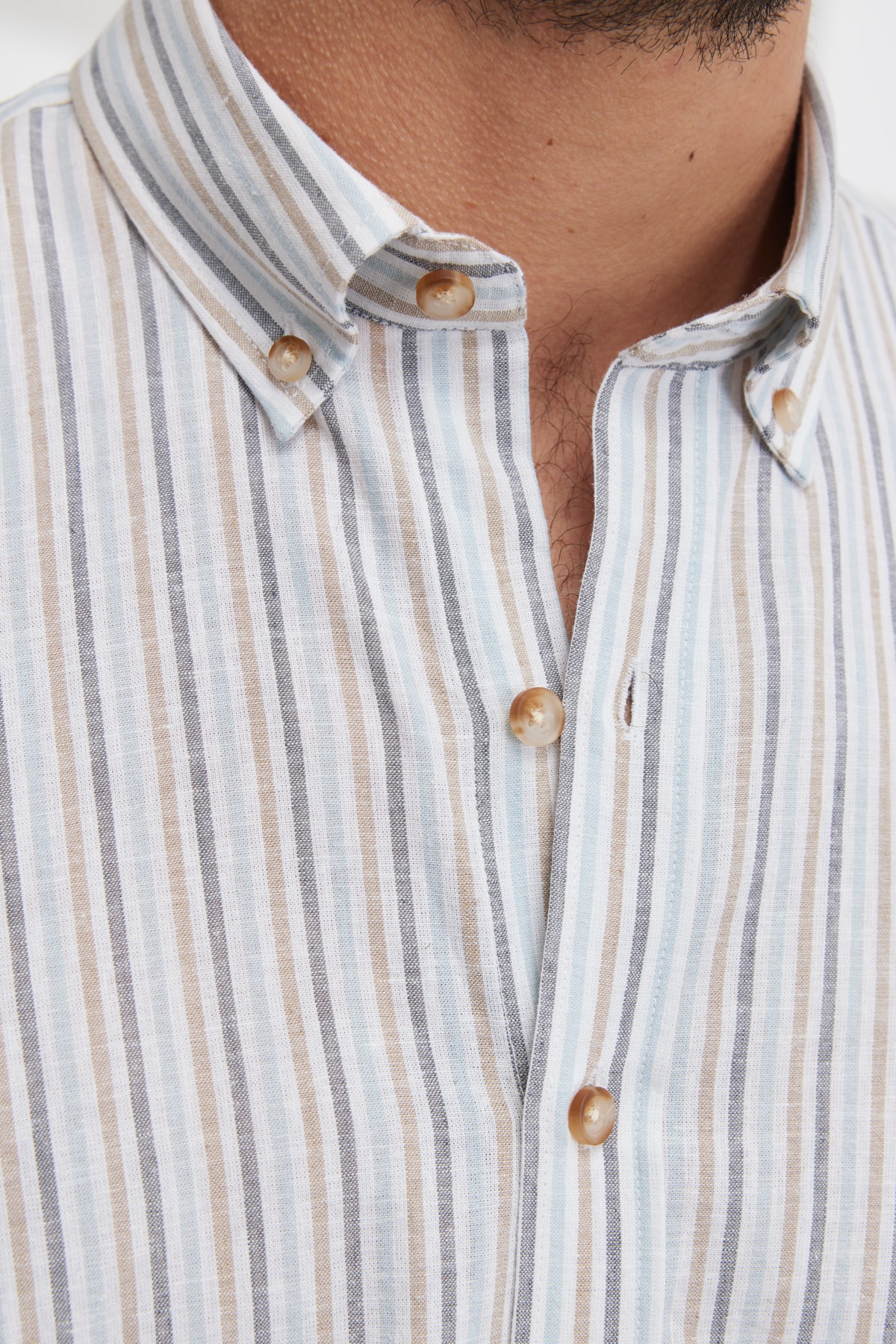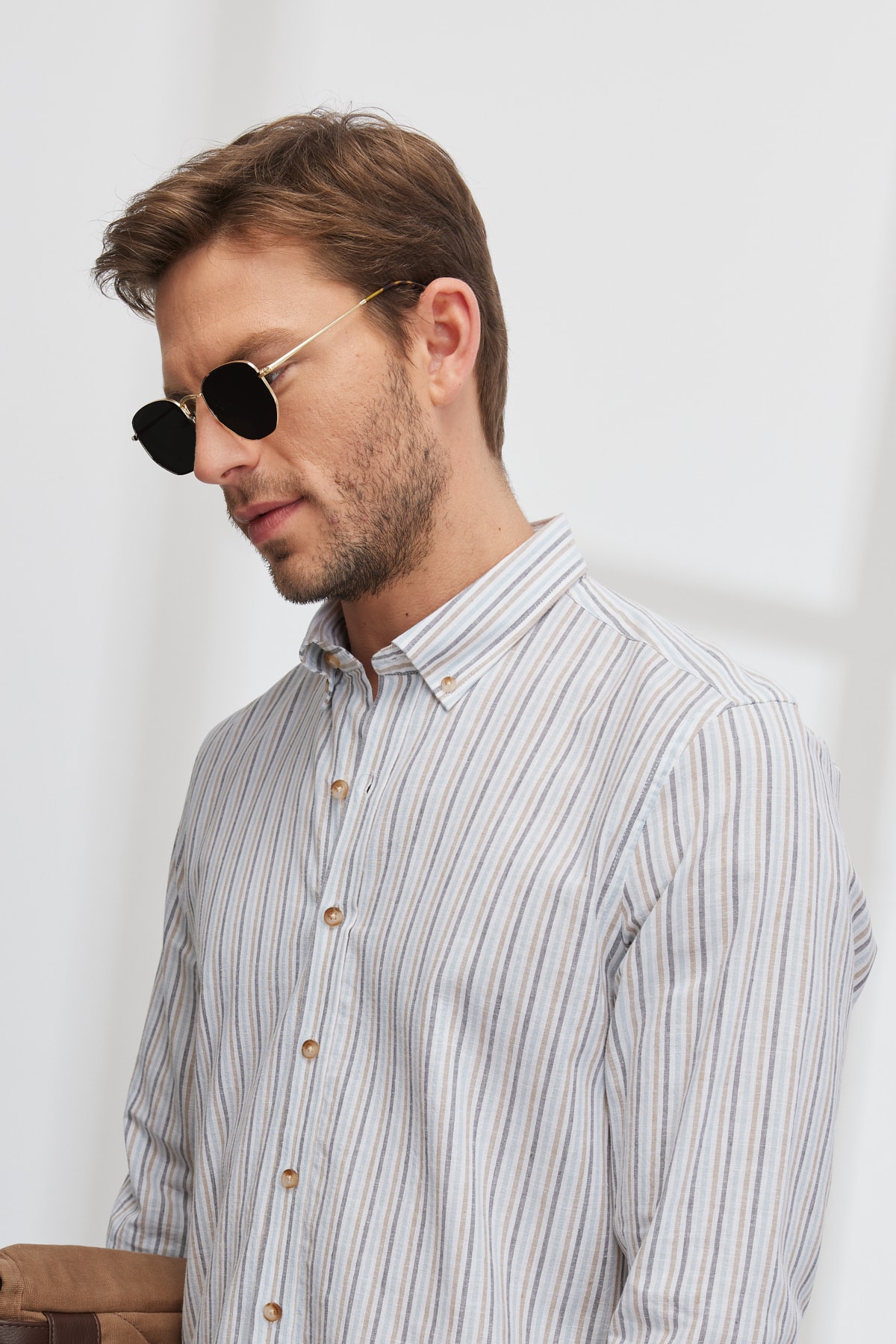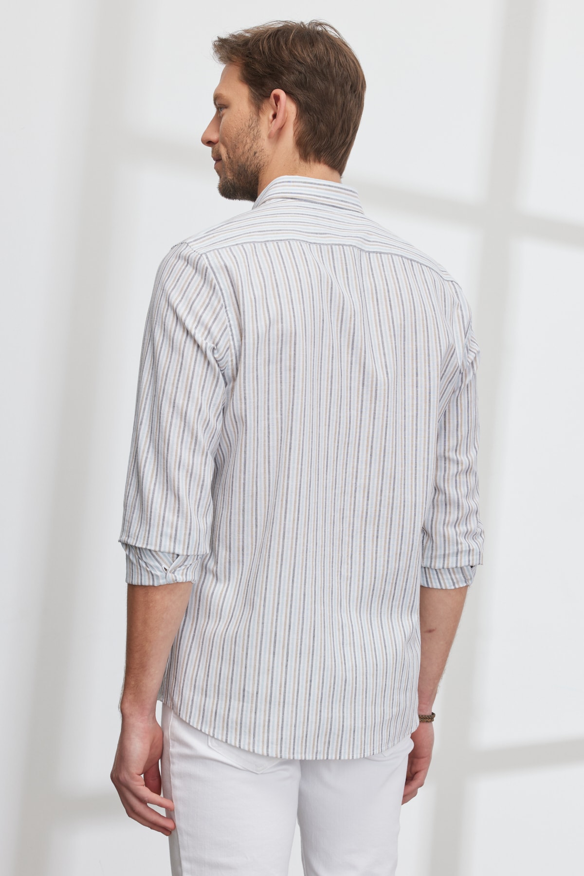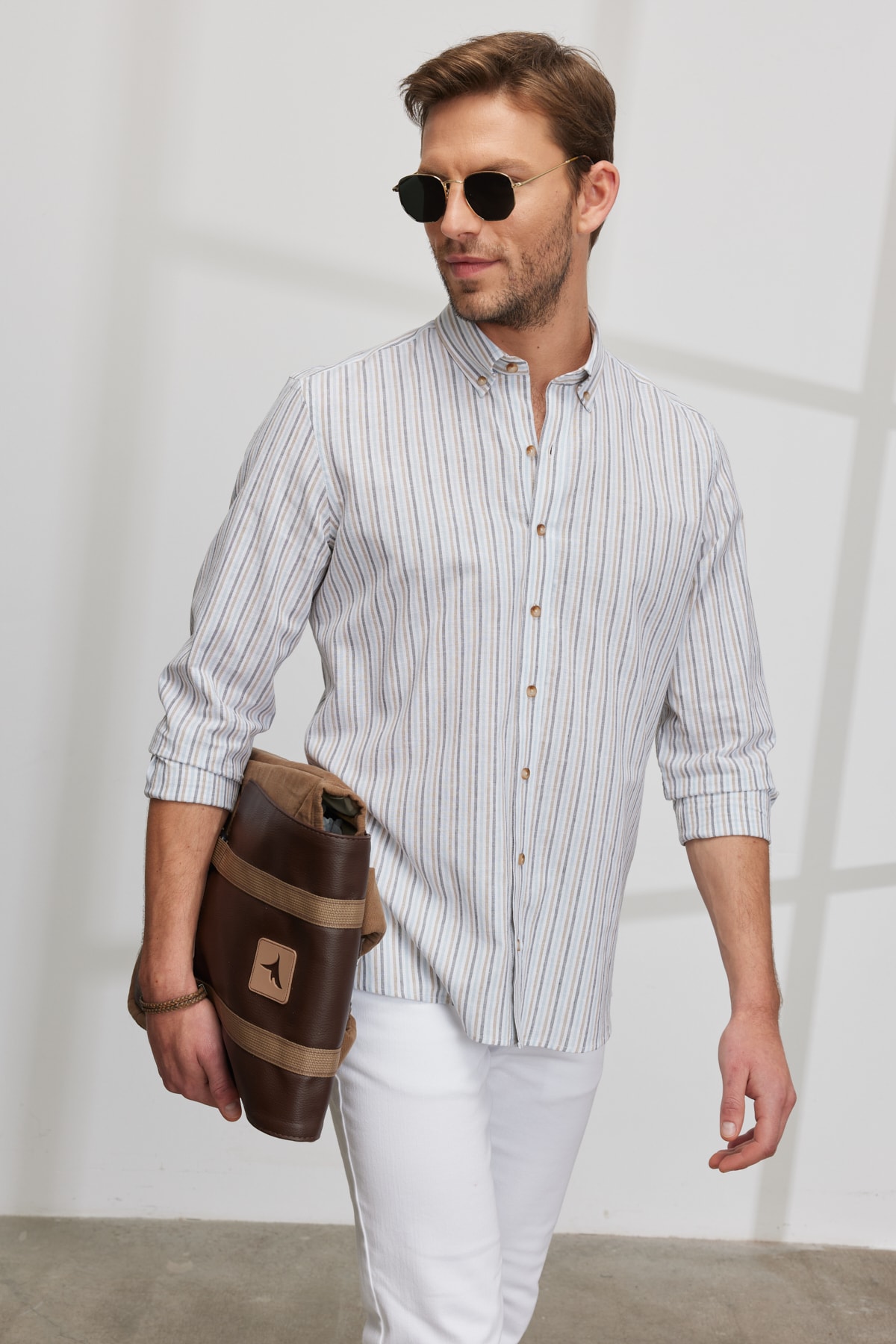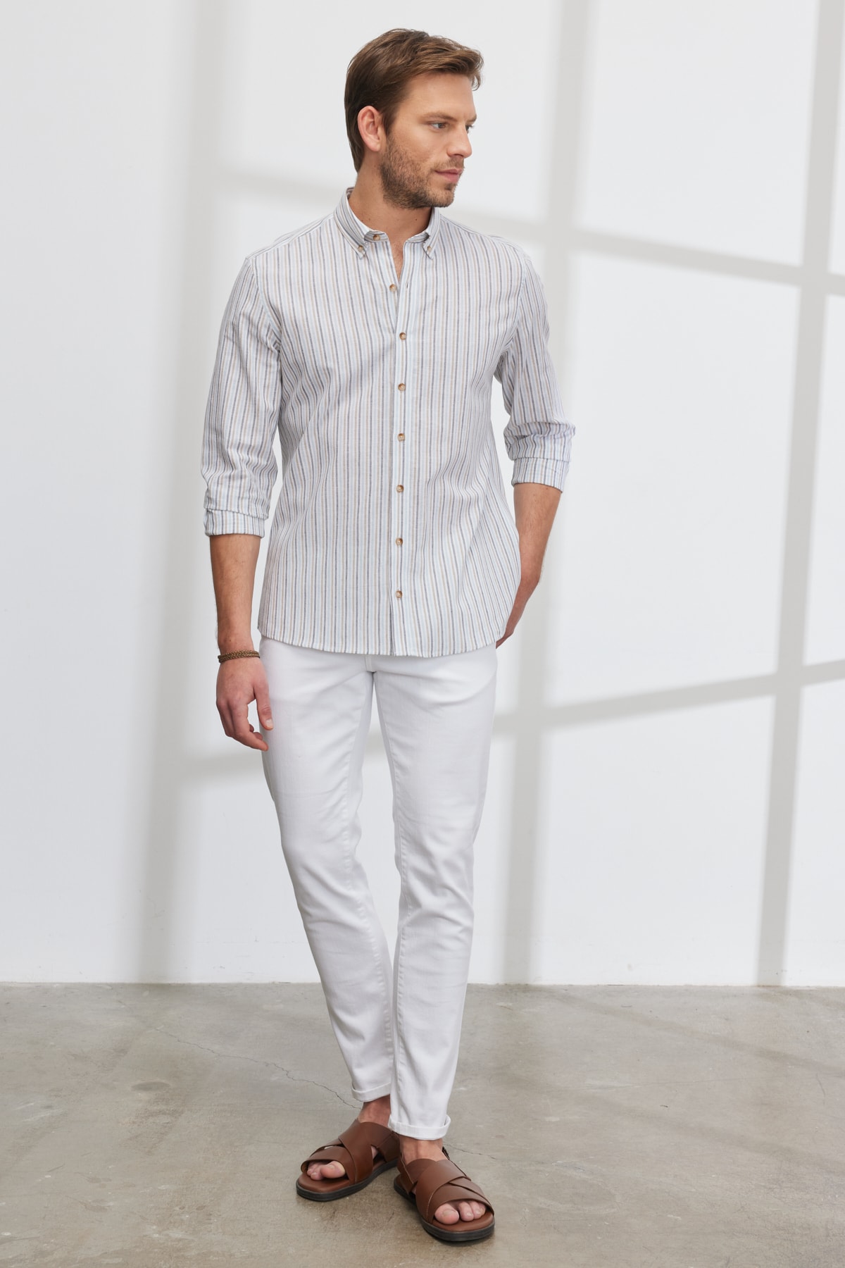 خرید اینترنتی پیراهن مردانه مردانه سفید-بژ، طرح کتان، یقه دکمهدار باریک و اسلیم فیت برند آلتین ییدلیز کلاسیکس Altınyıldız Classics اورجینال از Altınyıldız Classics نمایندگی ترکیه
