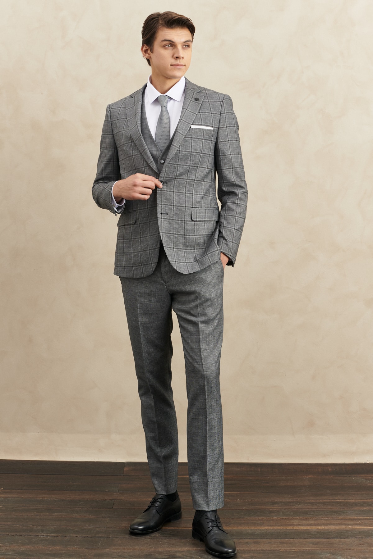 خرید اینترنتی کت و شلوار کلاسیک مردانه خاکستری اسلیم فیت با یقه تک رنگ و جلیقه چهارخانه برند آلتین ییدلیز کلاسیکس Altınyıldız Classics اورجینال از Altınyıldız Classics نمایندگی ترکیه