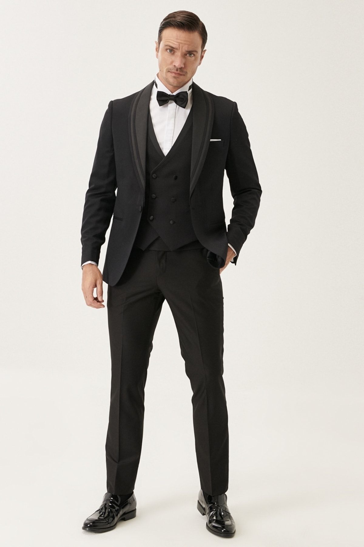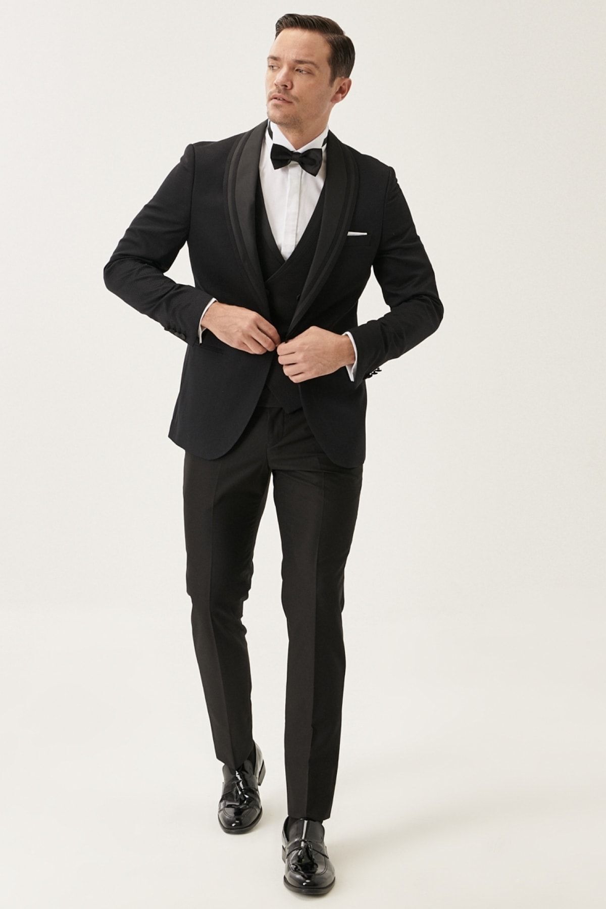 خرید اینترنتی تاکسیدوی مردانه طرح‌دار مشکی اسلیم فیت با جلیقه، مناسب داماد برند آلتین ییدلیز کلاسیکس Altınyıldız Classics اورجینال از Altınyıldız Classics نمایندگی و فروشگاه معتبر ترکیه