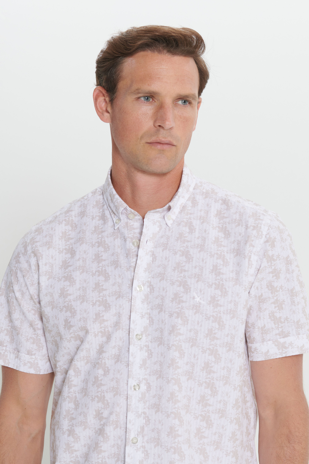 ۱۰۰٪ پنبه، بژ-سفید، بدون جیب، فیت باریک، آستین کوتاه، یقه دکمهدار، کالکشن تابستانی، سایز محصول: ۵۰، ابعاد مدل: قد: ۱.۸۹ سانتیمتر، وزن: ۸۰ کیلوگرم، پیراهن چاپی یقه دکمهدار ۱۰۰٪ پنبهای از کالکشن Altınyıldız، فیت باریک، برش باریک.