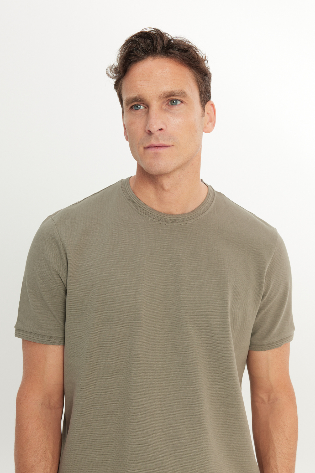 ۱۰۰٪ پنبه، ساده، خاکی، فیت باریک، یقه گرد، آستین کوتاه، بدون جیب، کالکشن تابستانی، تیشرت یقه گرد ۱۰۰٪ پنبهای فیت باریک Altınyıldız Classics.