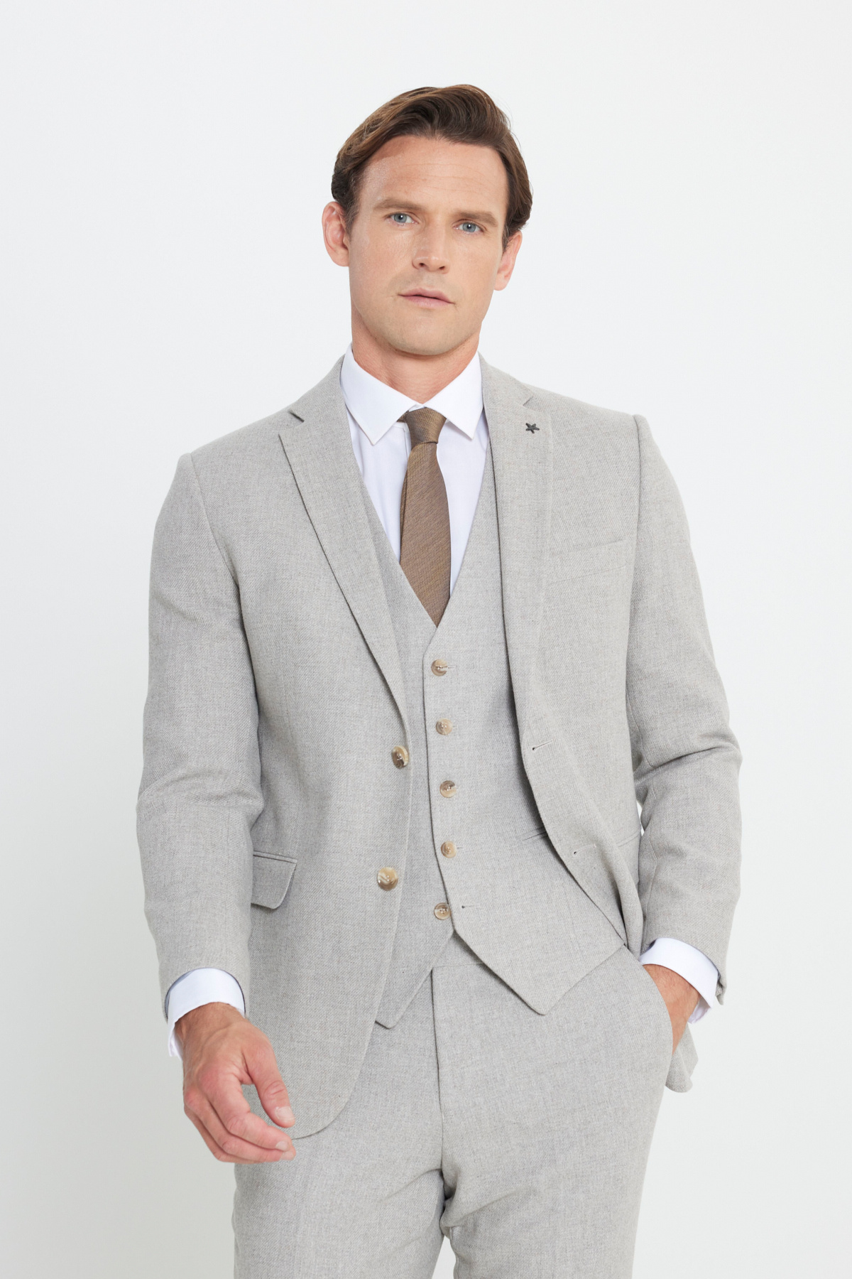 خرید اینترنتی کت و شلوار مردانه پشمی بژ، باریک، یقه تک رنگ، طرح دار مورب، جیب های کناری و جلیقه برند آلتین ییدلیز کلاسیکس Altınyıldız Classics اورجینال از Altınyıldız Classics نمایندگی ترکیه