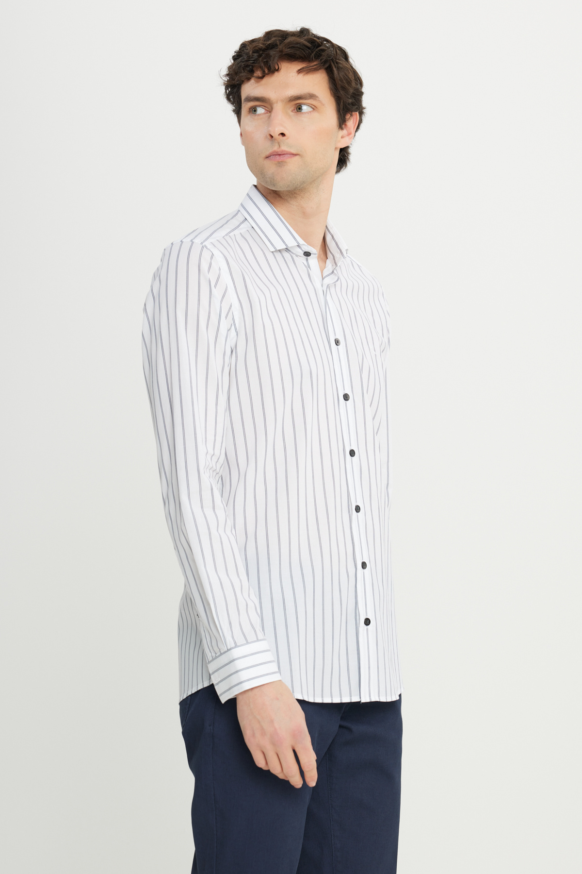 خرید اینترنتی پیراهن مردانه سفید-سرمه‌ای ۱۰۰٪ پنبه‌ای اسلیم فیت یقه ایتالیایی کوچک راه راه برند آلتین ییدلیز کلاسیکس Altınyıldız Classics اورجینال از Altınyıldız Classics نمایندگی ترکیه