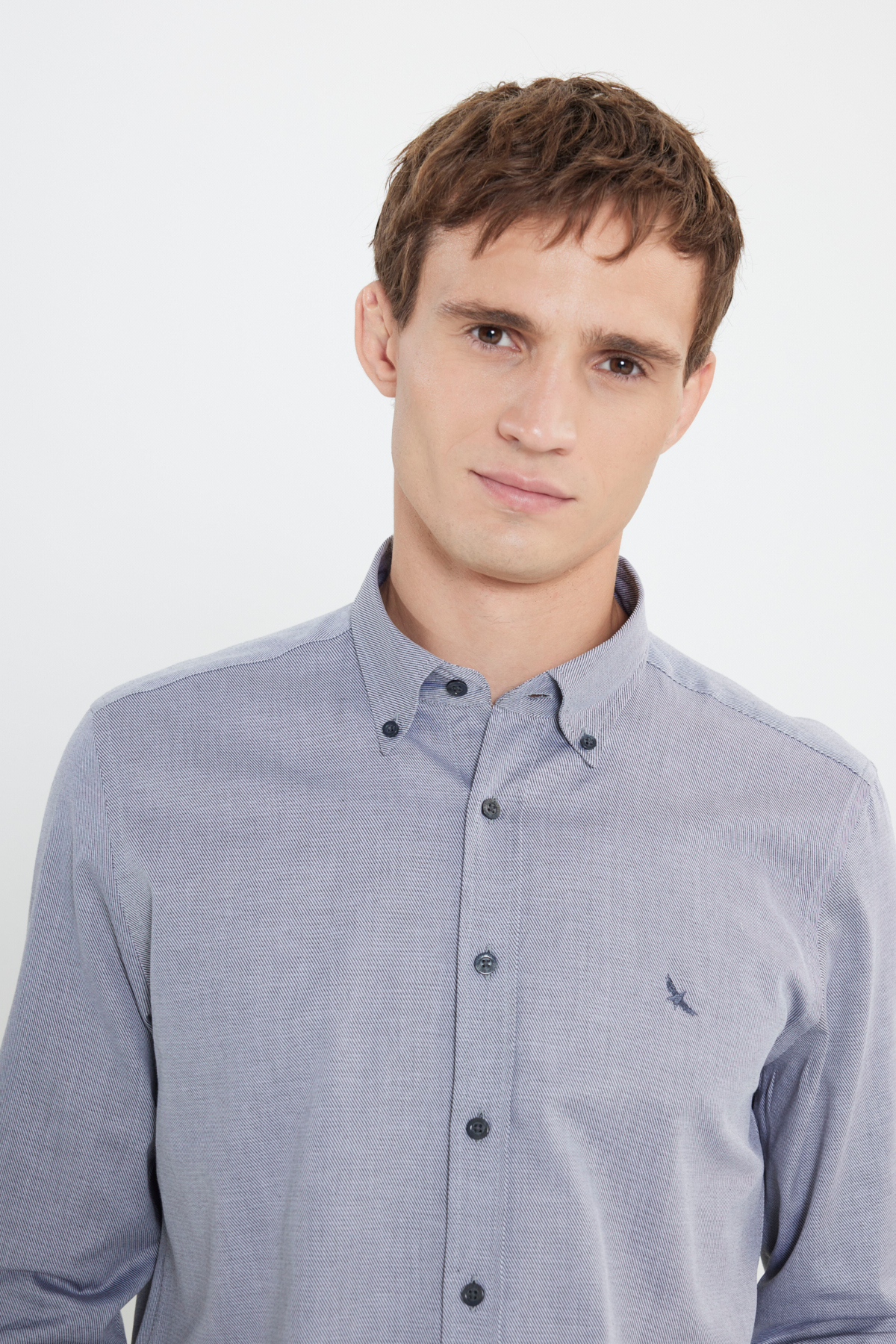 کلکسیون آلتینییلدیز، ۱۰۰٪ پنبه، آکسفورد، فیت باریک، یقه دکمهدار، طرح مورب، سایز محصول: L، ابعاد مدل: قد: ۱.۸۹ سانتیمتر، وزن: ۸۰ کیلوگرم، کد محصول: COE202510179ATR.