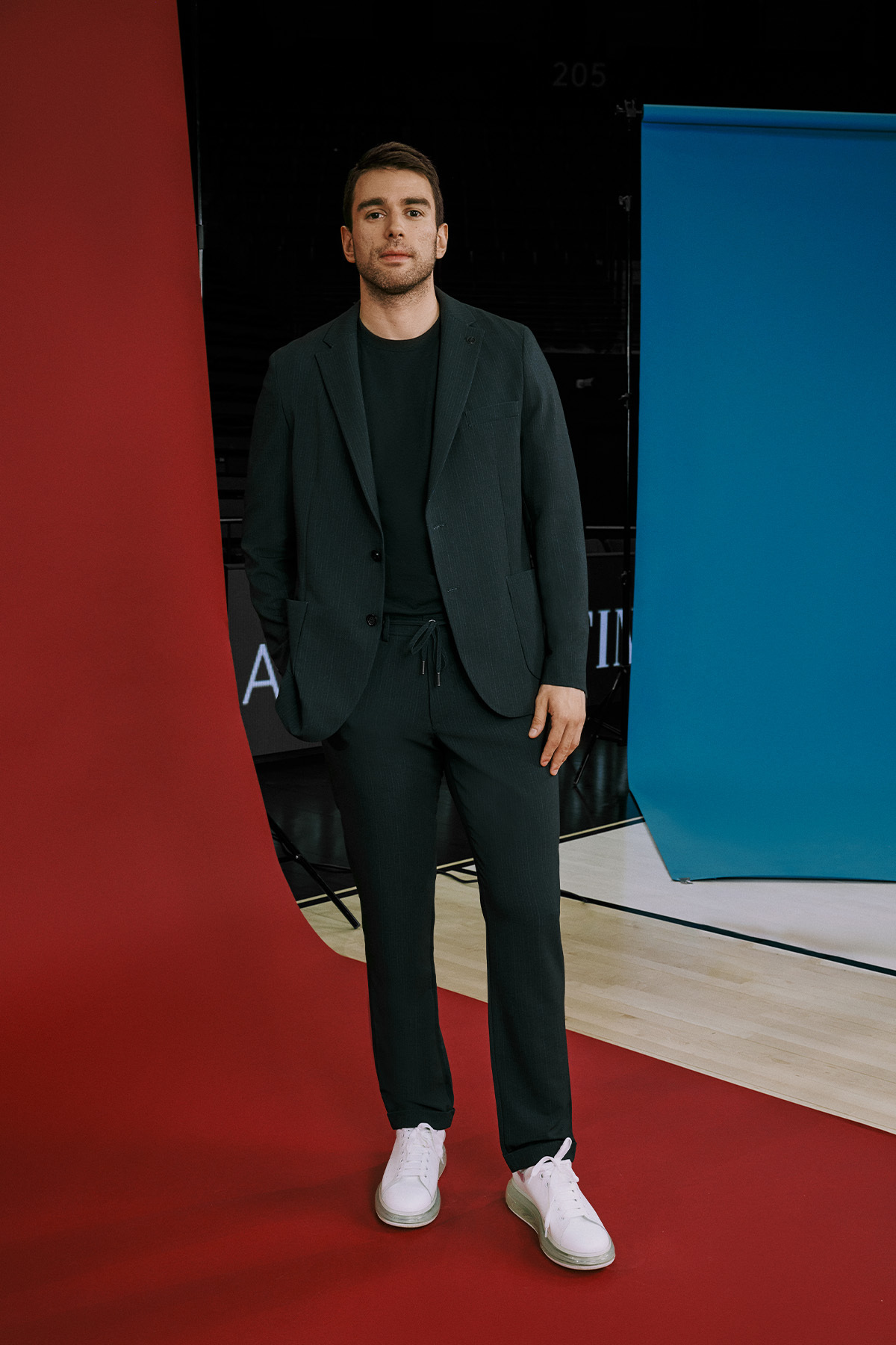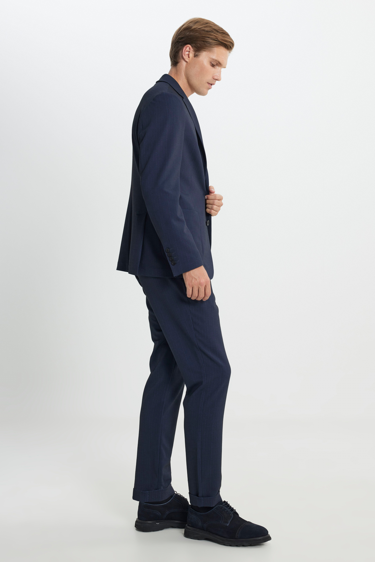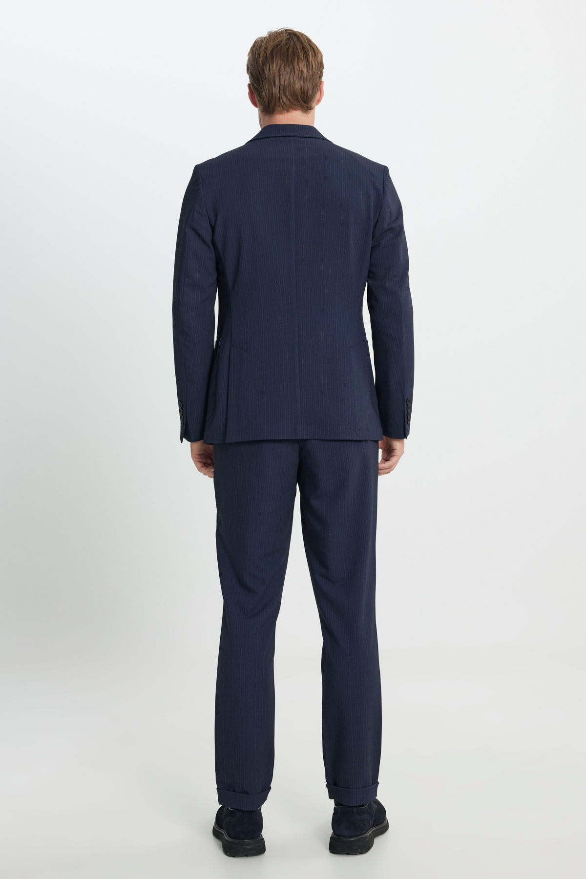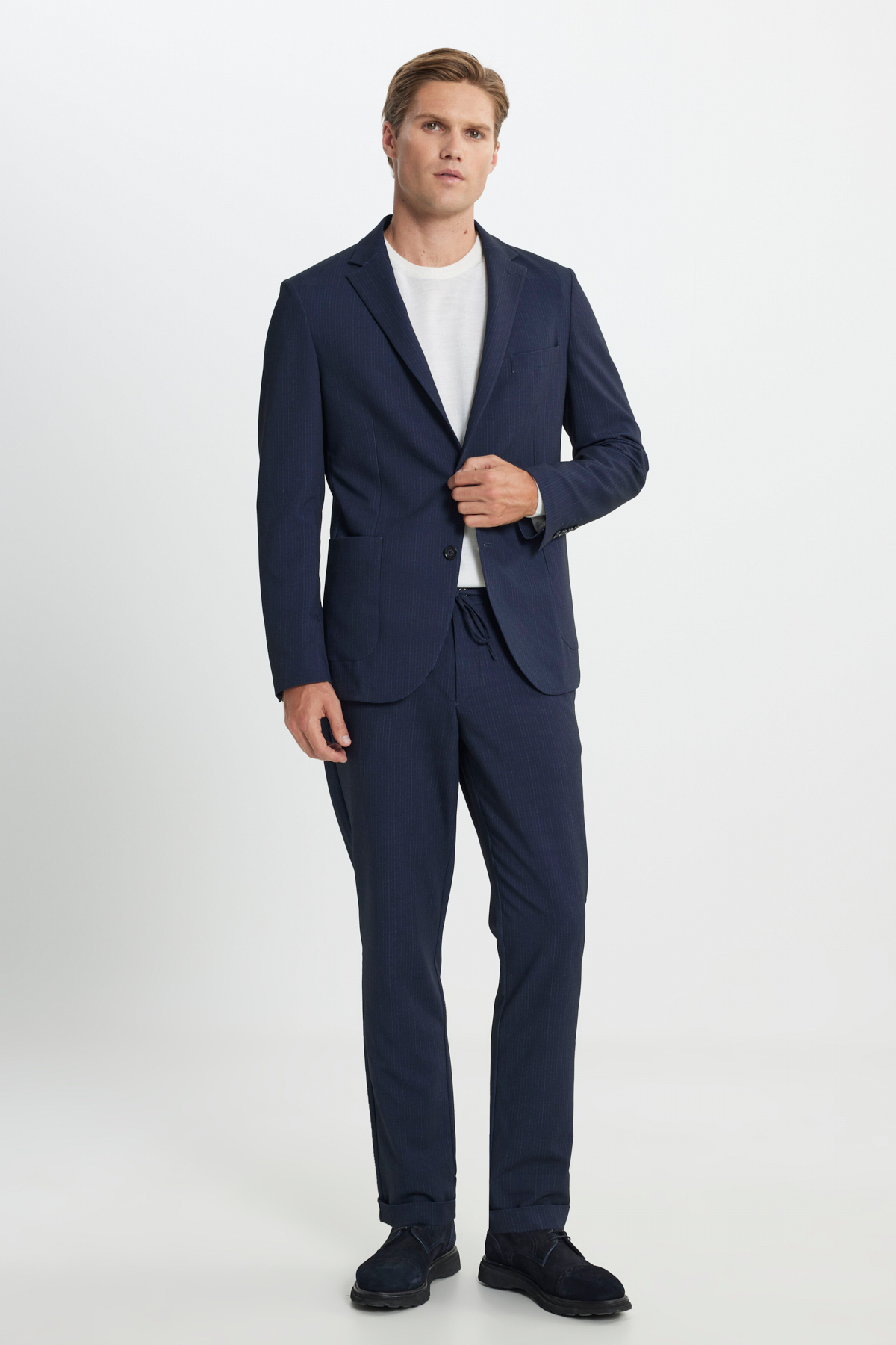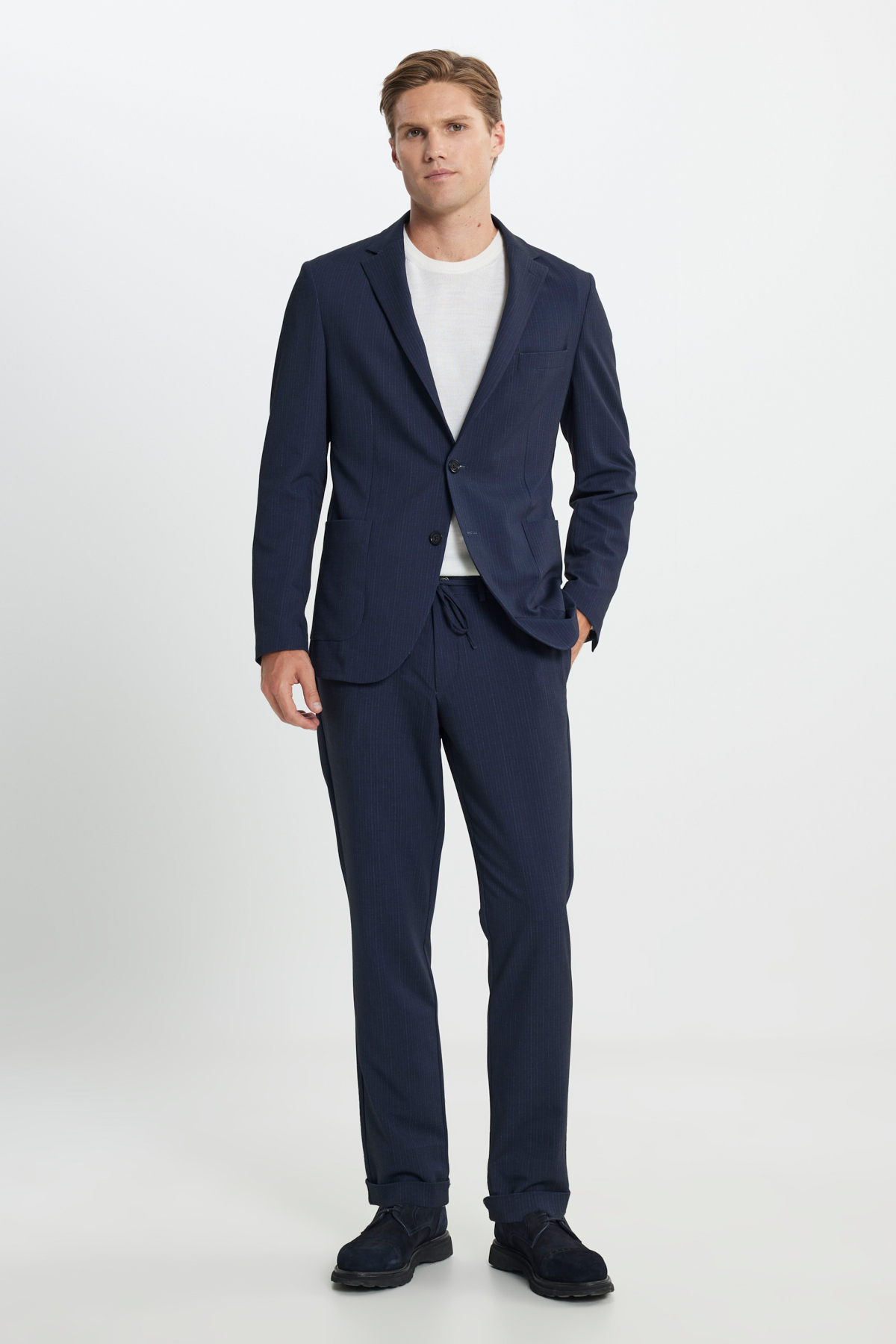 خرید اینترنتی کت و شلوار مردانه سرمهای، باریک، یقه گرد، کمر کشی، راه راه با جیبهای وصلهدار برند آلتین ییدلیز کلاسیکس Altınyıldız Classics اورجینال از Altınyıldız Classics نمایندگی ترکیه