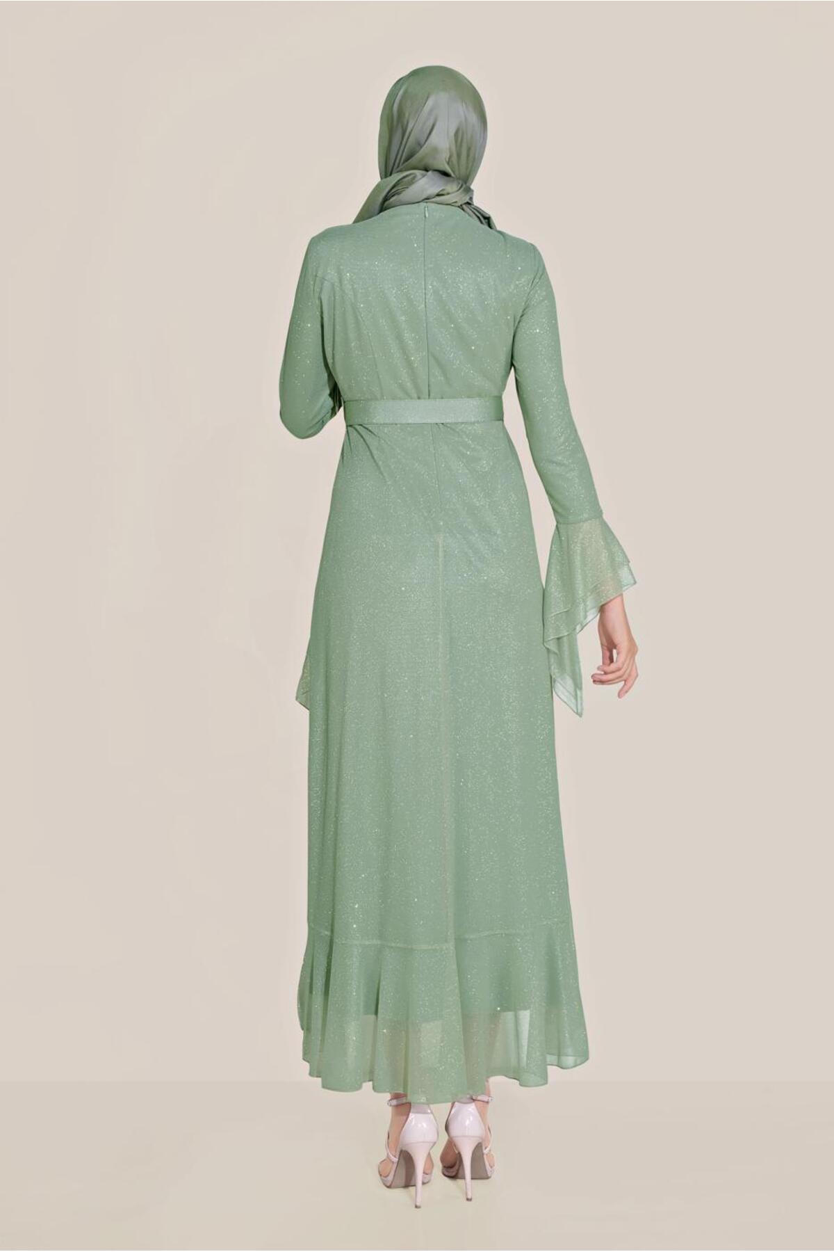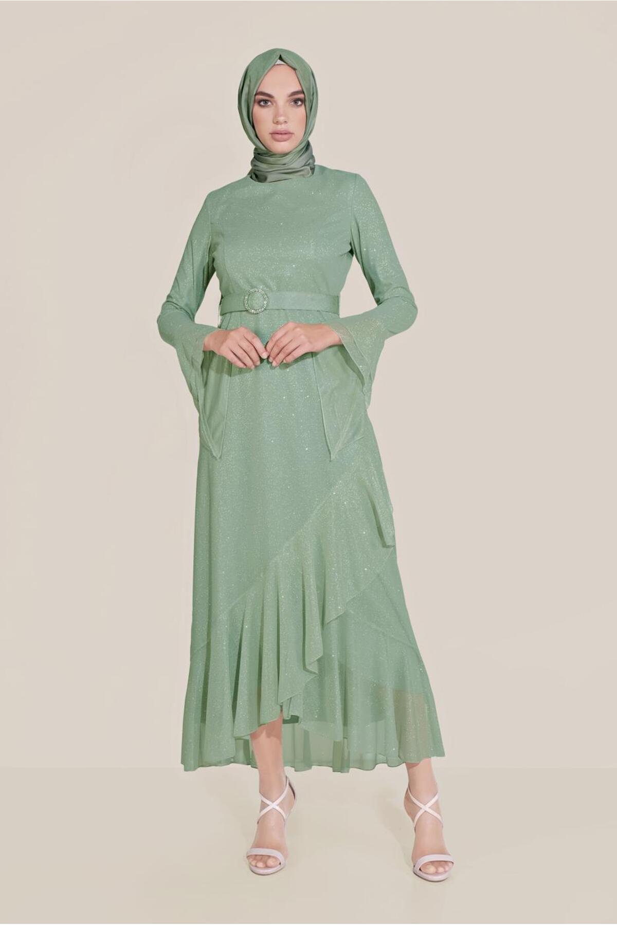 خرید اینترنتی لباس مجلسی زنانه با کمربند آستین شیپوری ۴۰۷۷۳ برند آلوینا Alvina اورجینال از ALVİNA نمایندگی ترکیه