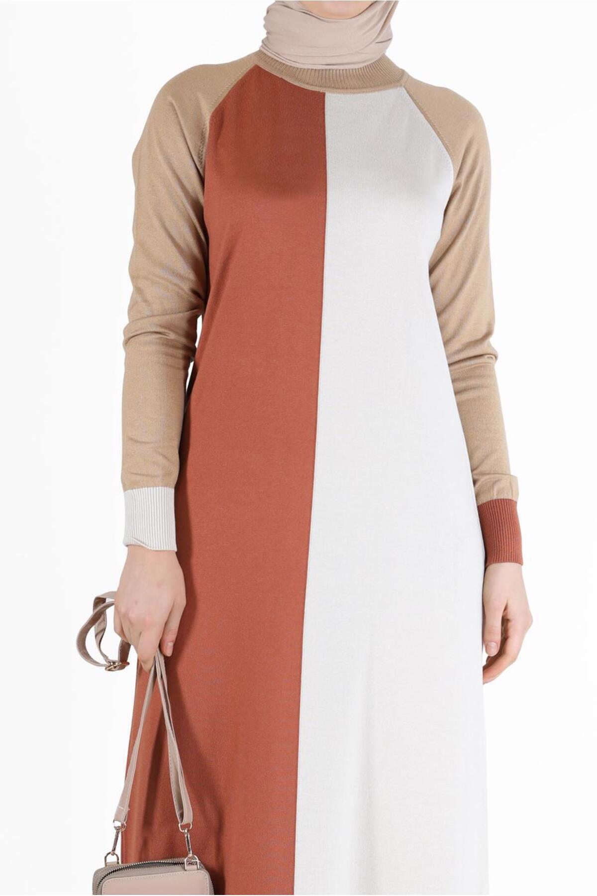 این لباس بافتنی سه رنگ، با طرح رنگی خود، ظاهری مدرن و شیک ارائه میدهد و برای استفاده روزمره ایدهآل است.