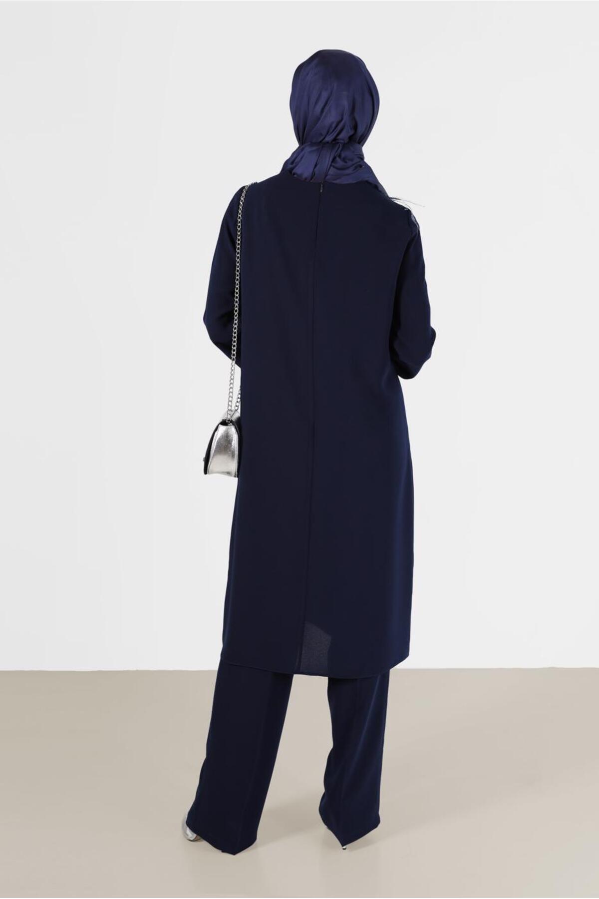 این ست با طرح ساده و رنگ سرمهای، ظرافتی جاودانه را به نمایش میگذارد و به قطعهای ضروری در مجموعه لباسهای ساده شما تبدیل خواهد شد.