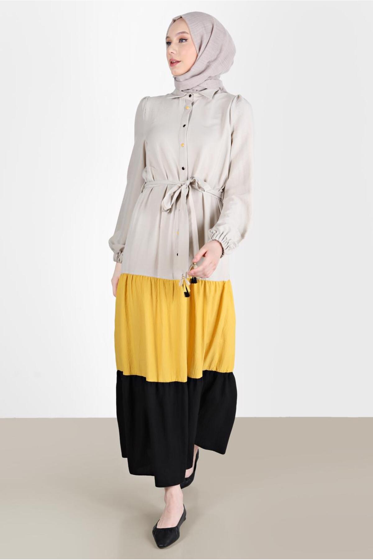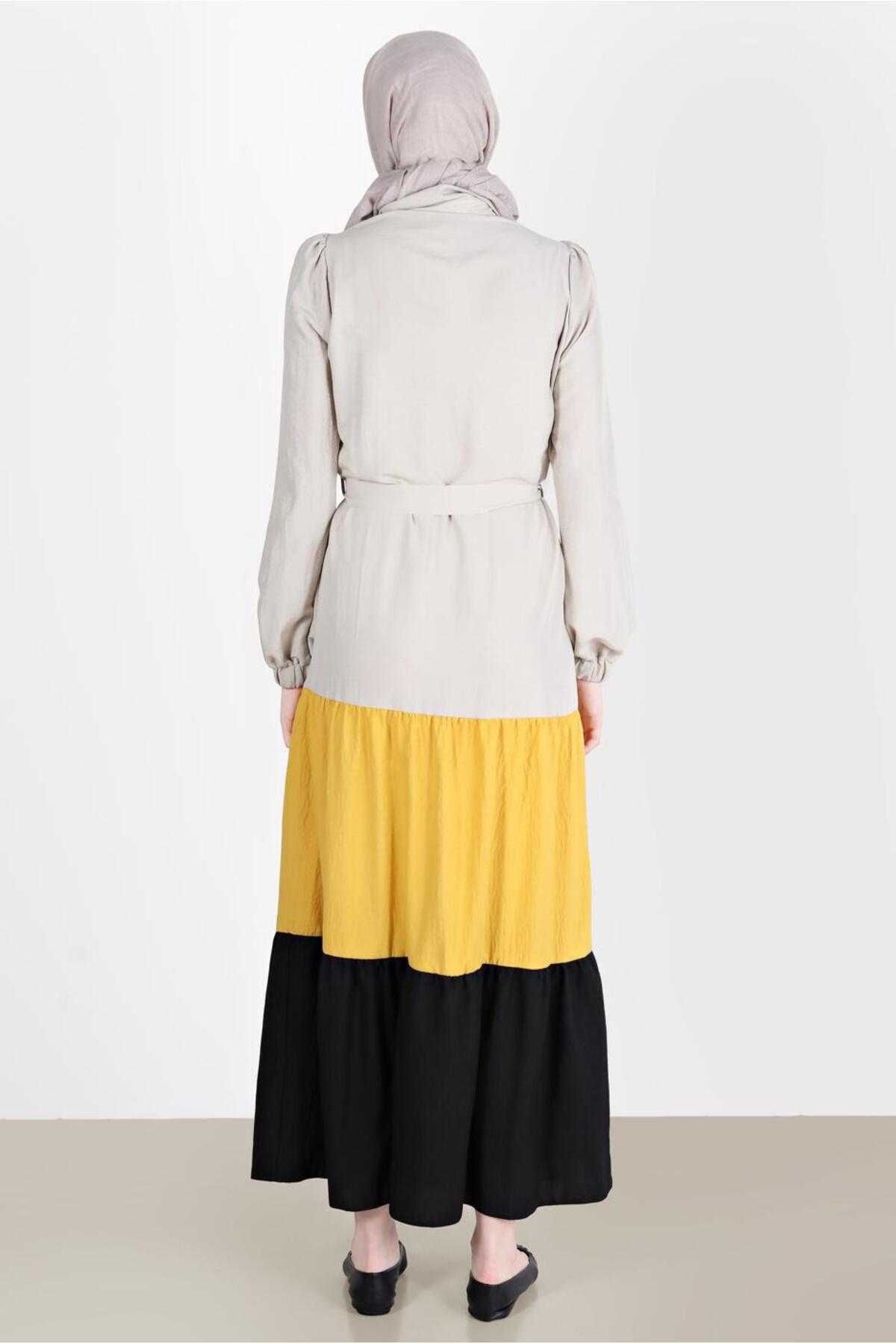 لباس بلند زنانه آلوینا آستین چین دار بلوک رنگی | Alvina 22YELB0042625