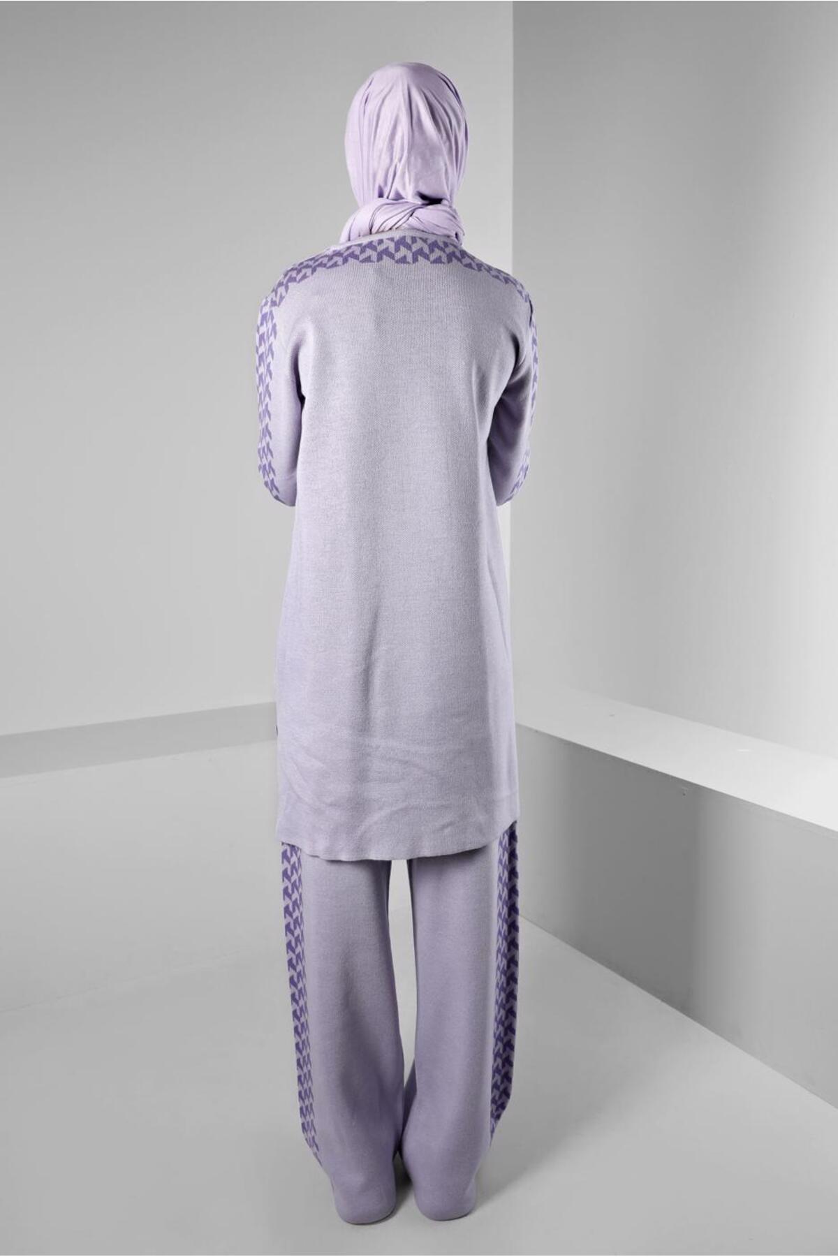 این کت و شلوار بافتنی دو تکه طرحدار، که مخصوص مجموعه لباسهای پوشیده طراحی شده است، ظاهری شیک و مدرن ارائه میدهد.