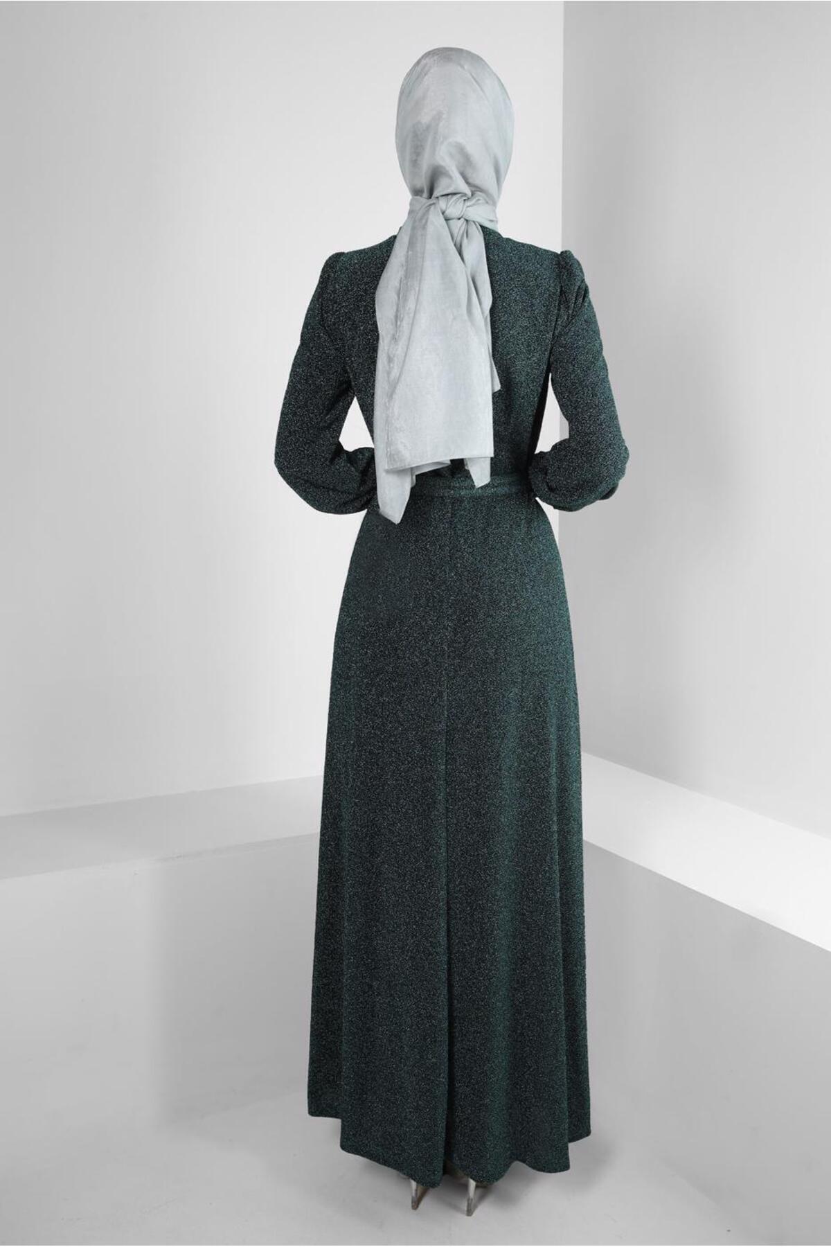 این لباس شب ساده، با بافت بافتنی براق، ظاهری خیرهکننده ارائه میدهد و با رنگ سبز زمردی خود، فریبنده است.