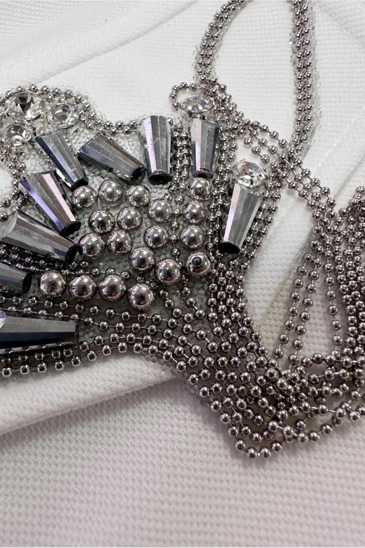 جزئیات مرواریدی آن، ظاهری چشمگیر به آن میبخشد، در حالی که یقه گرد، سبکی مدرن و شیک را برجسته میکند.