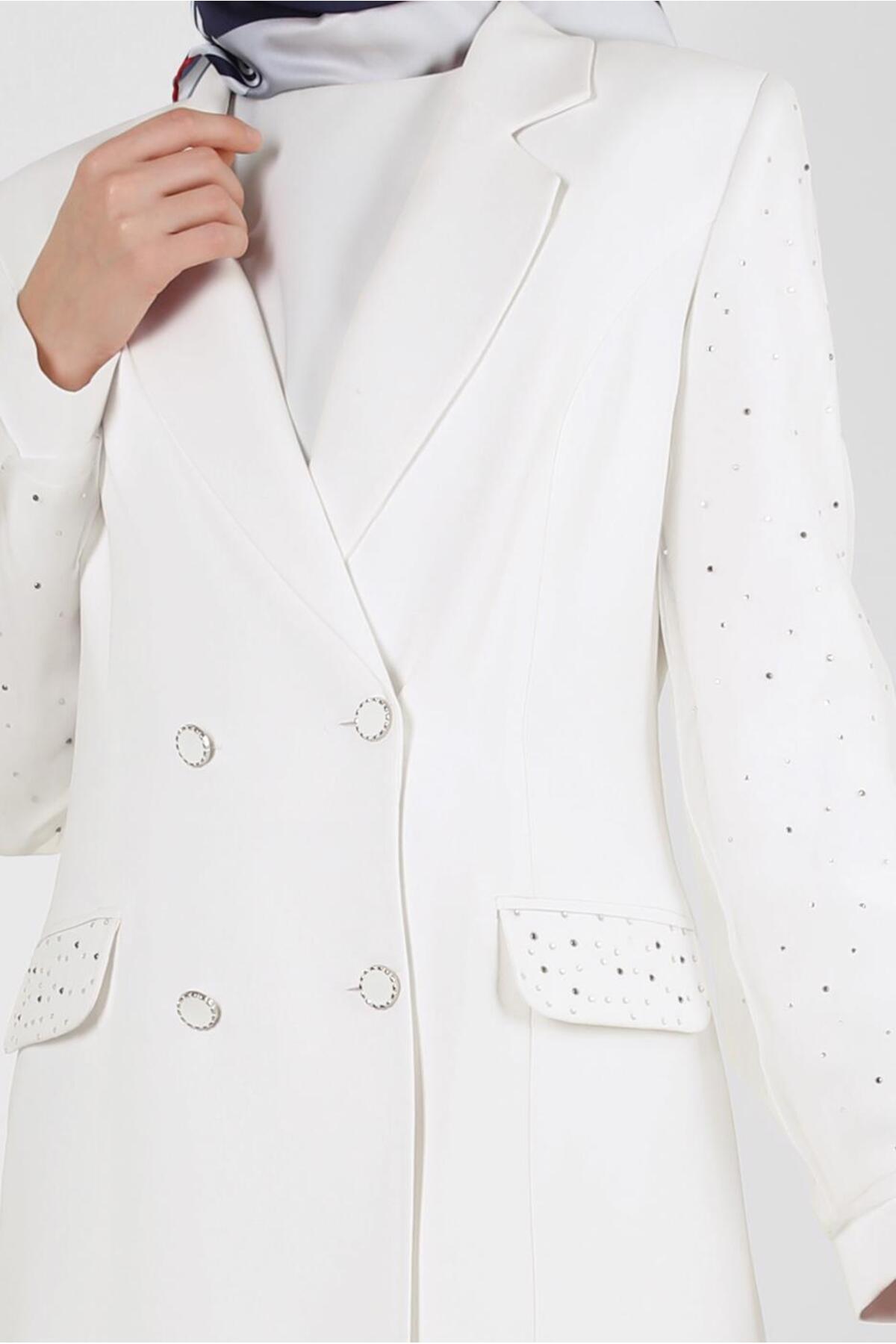 بست دکمه‌دار، یقه کت و آستین‌های بلند آن، سبک کلاسیک لباس‌های پوشیده را منعکس می‌کند.