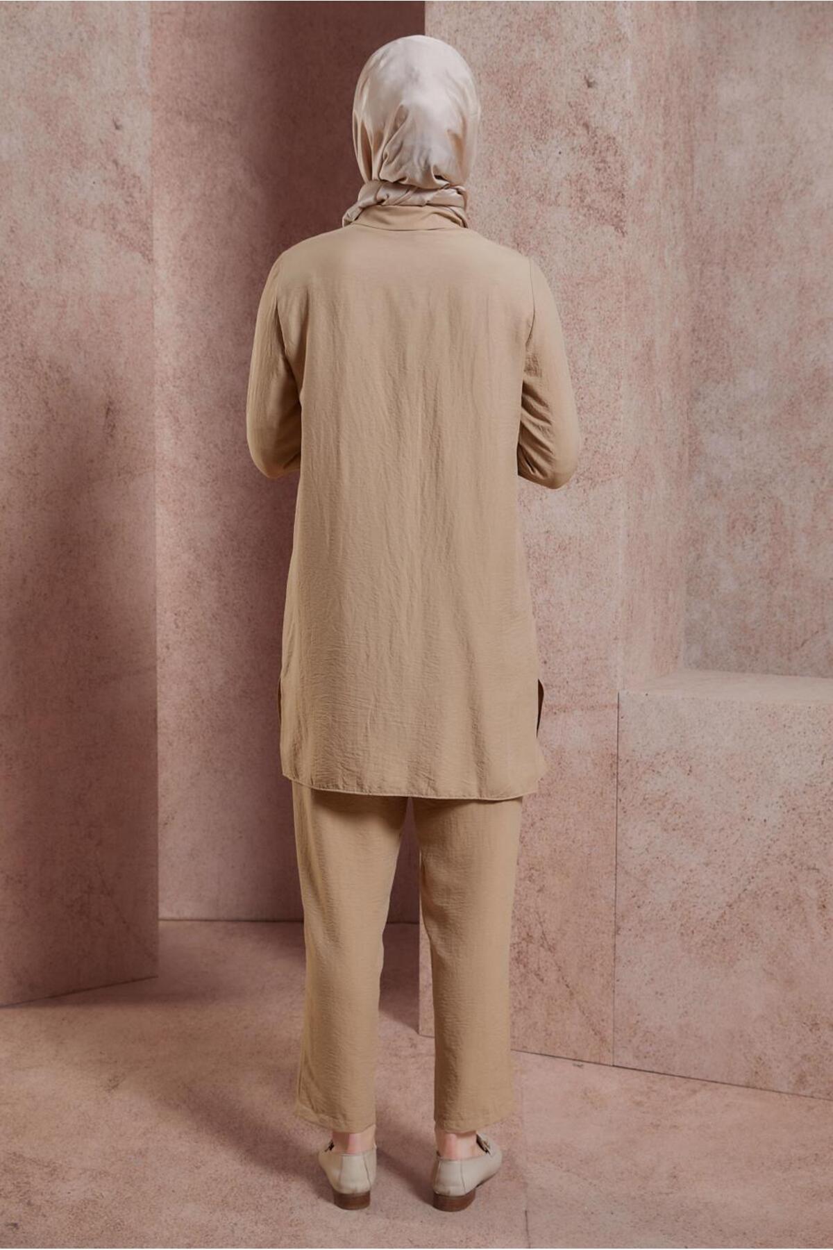 ترکیب تونیک بلند و شلوار کمر معمولی، راحتی و مطابقت با استانداردهای پوشش متوسط را تضمین میکند.