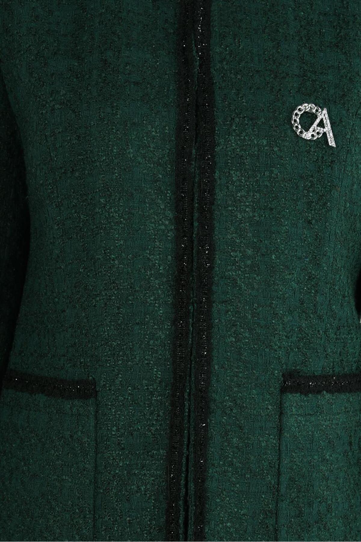 کت و شلوار دامندار تویید مدل 30403 با طراحی کلاسیک و شیک خود، با جزئیات سنجاق سینه، ظاهری چشمگیر در رنگ سبز زمردی خود ارائه میدهد.