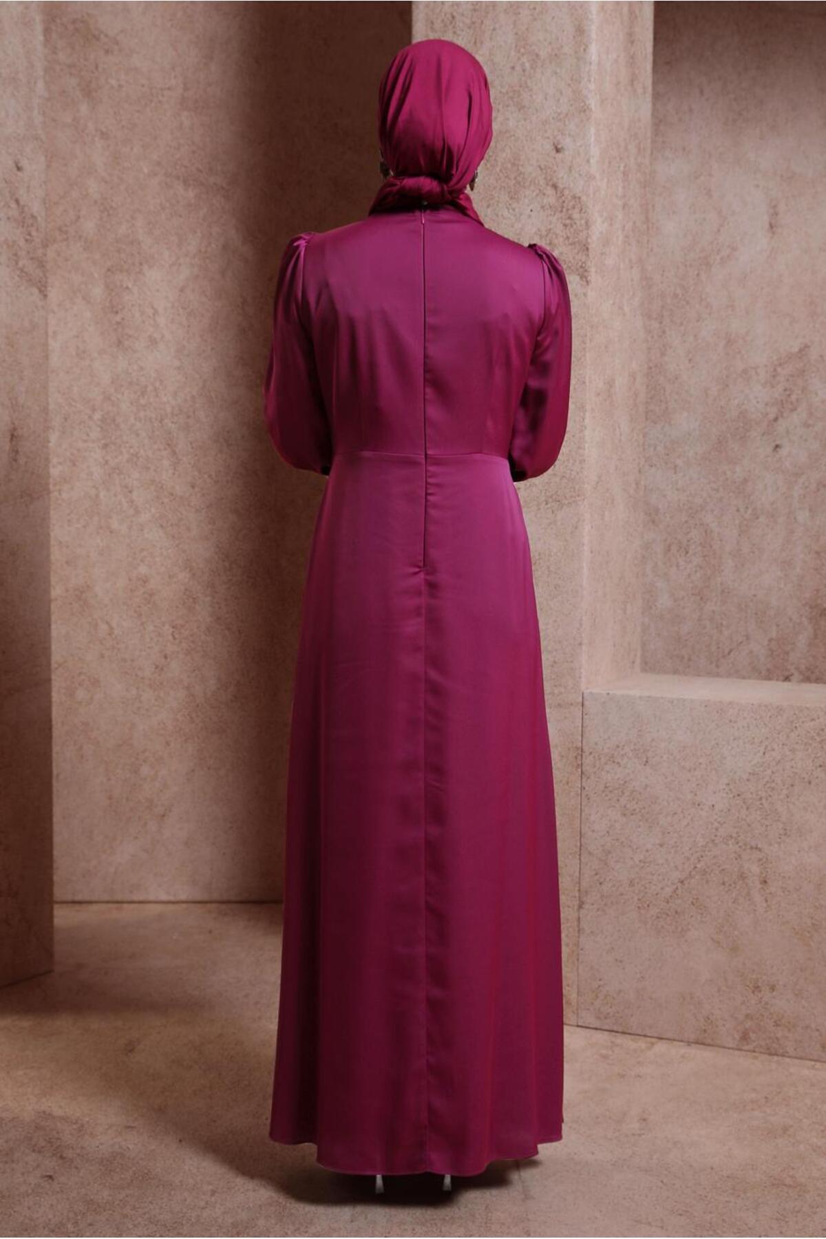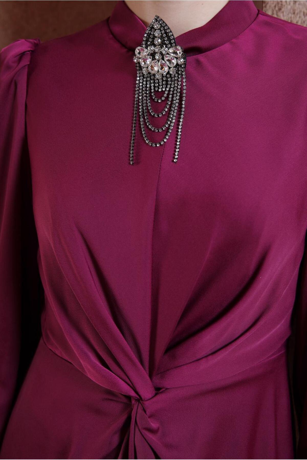 یک لباس شب ساتن مزین به سنجاق سینه از مجموعه لباسهای ساده، مناسب برای شبهای شیک و خاص شما.