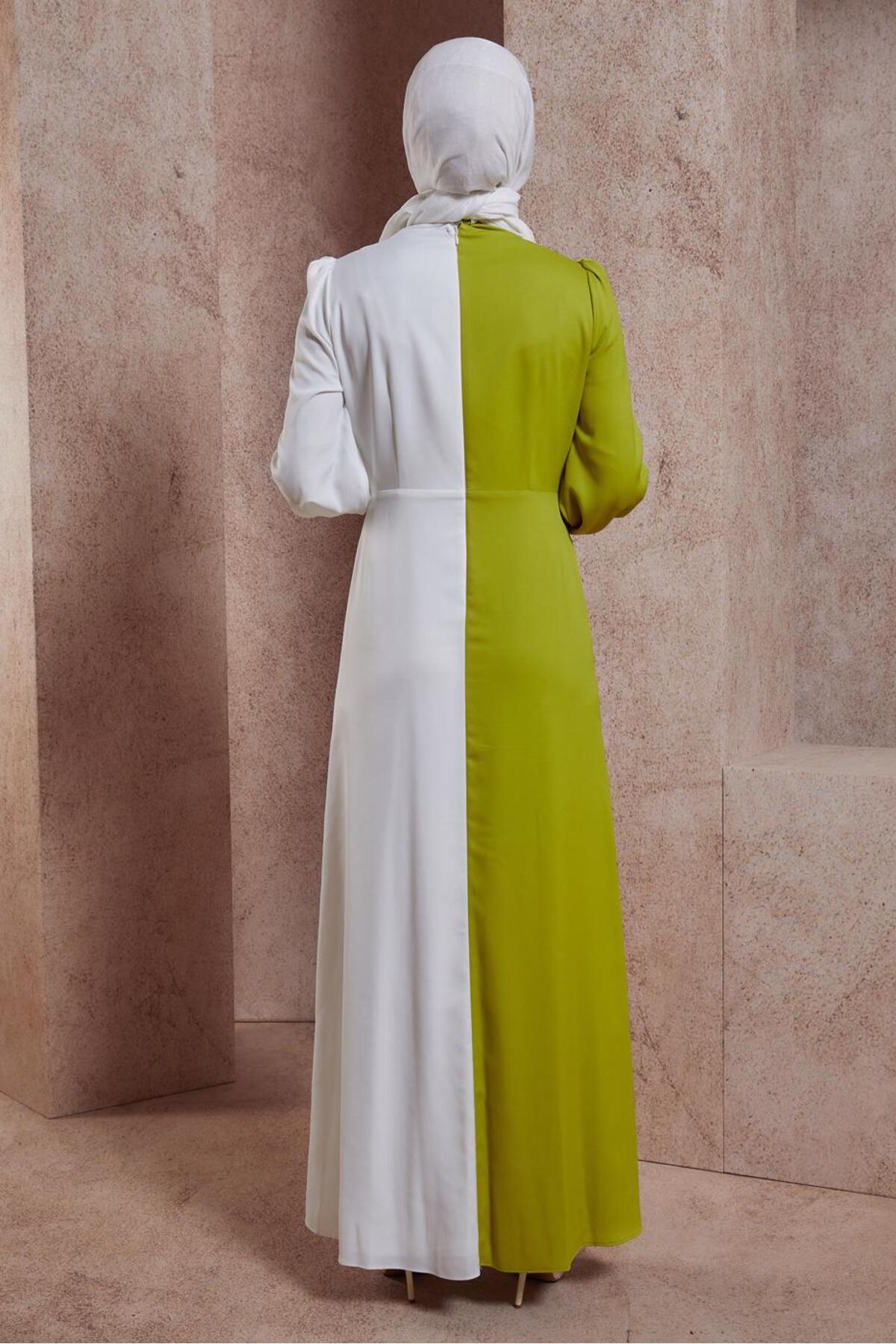 این لباس شب دو رنگ مسلمان، که با رنگهای سبز اسیدی طراحی شده است، ظاهری خیرهکننده برای مناسبتهای شیک شب ارائه میدهد.