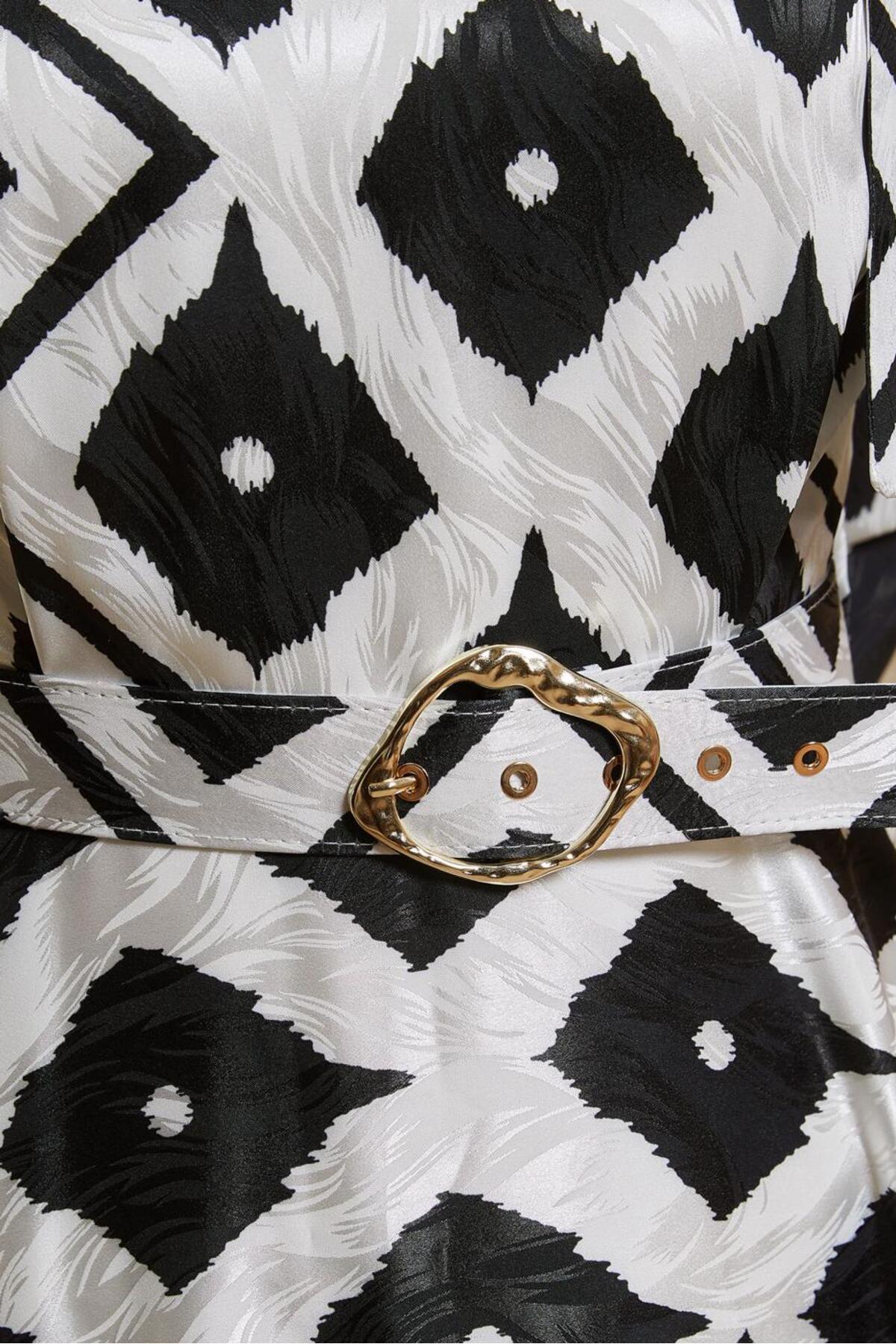جزئیات کمربند، کمر شما را به زیبایی برجسته میکند، در حالی که بافت ساتن، جلوهای لوکس به لباس میبخشد.