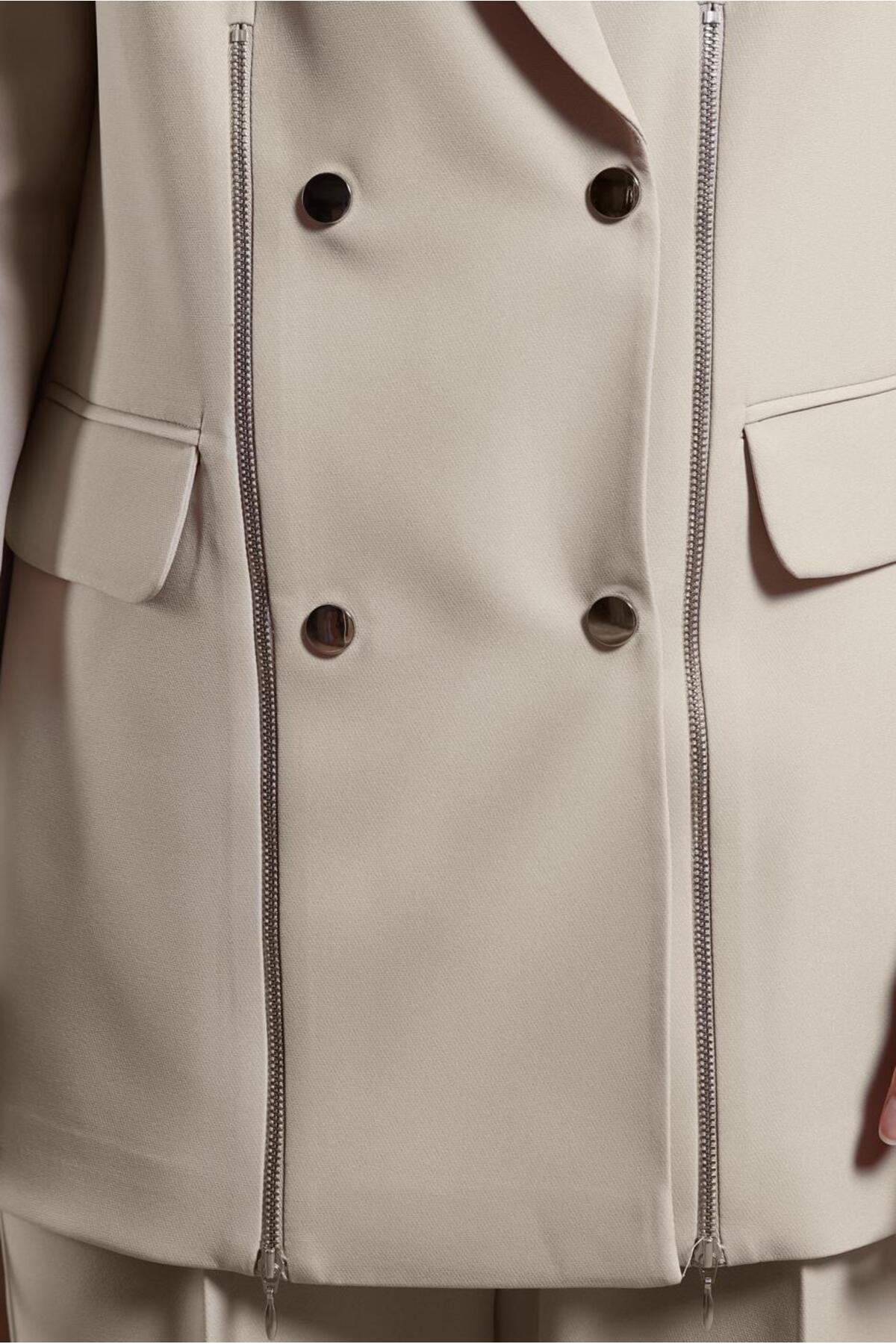 این ست دو تکه شامل یک ژاکت و شلوار است. ژاکت دارای جزئیات زیپ و طراحی دو پاچه شلوار است که آن را به یک لباس چشمگیر تبدیل میکند.