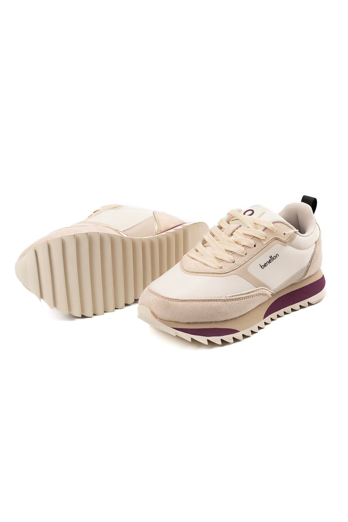 – کفش ورزشی زنانه Benetton با زیره ضخیم بژ، طراحی شده برای بزرگسالان و ارائه دهنده سبکی یونیسکس.