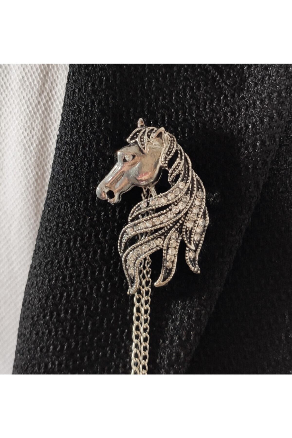 خرید اینترنتی سنجاق یقه فلزی نقرهای خاکستری طرح اسب با زنجیر یقه تزیینی سنگی برند BLC Basic Line Co. اورجینال از Basic Line Co. نمایندگی ترکیه