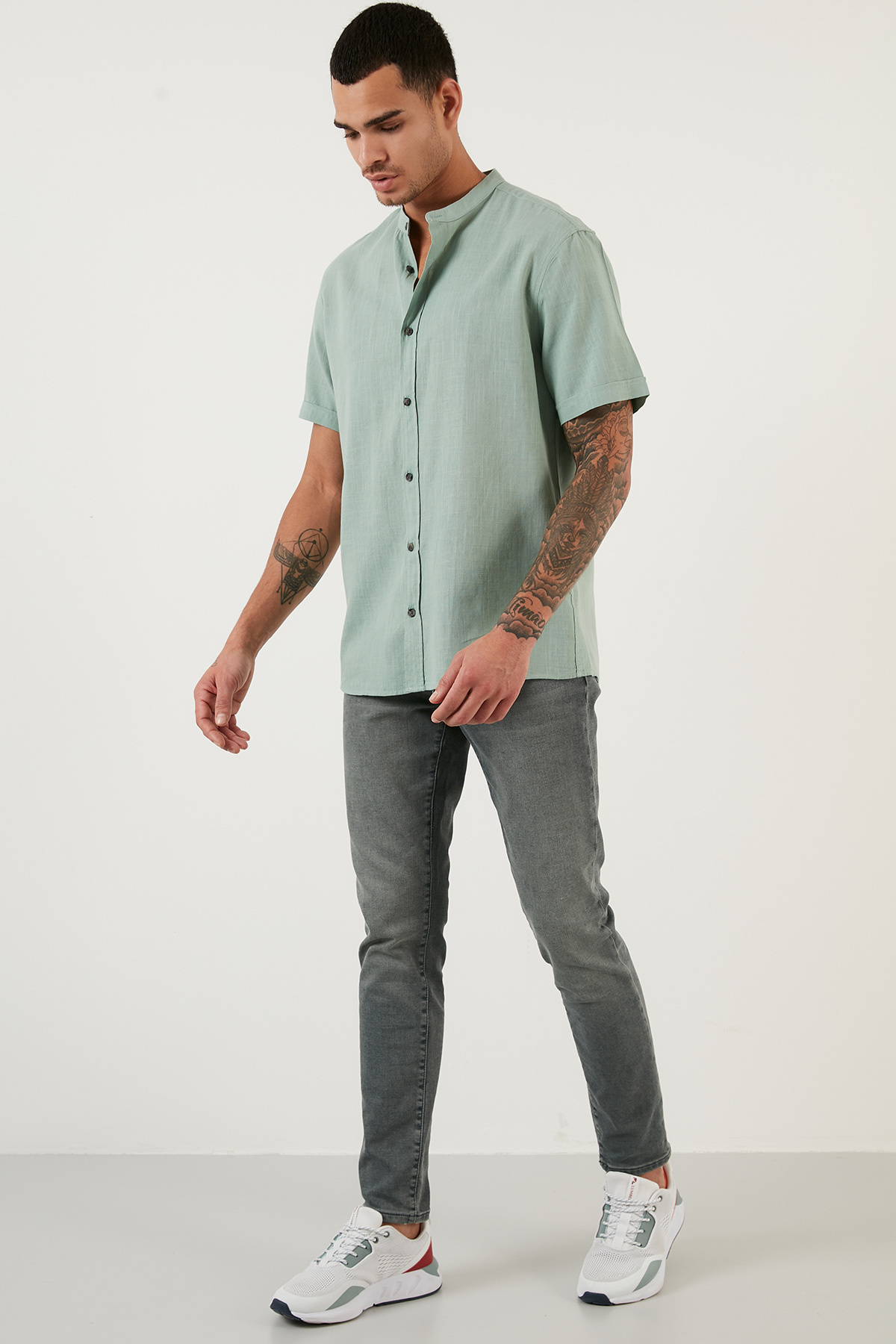 خرید اینترنتی پیراهن مردانه آستین کوتاه یقه ماندارین طرح کتان نخی Cf21s113899 برند بوراتی Buratti اورجینال از Markastok نمایندگی ترکیه