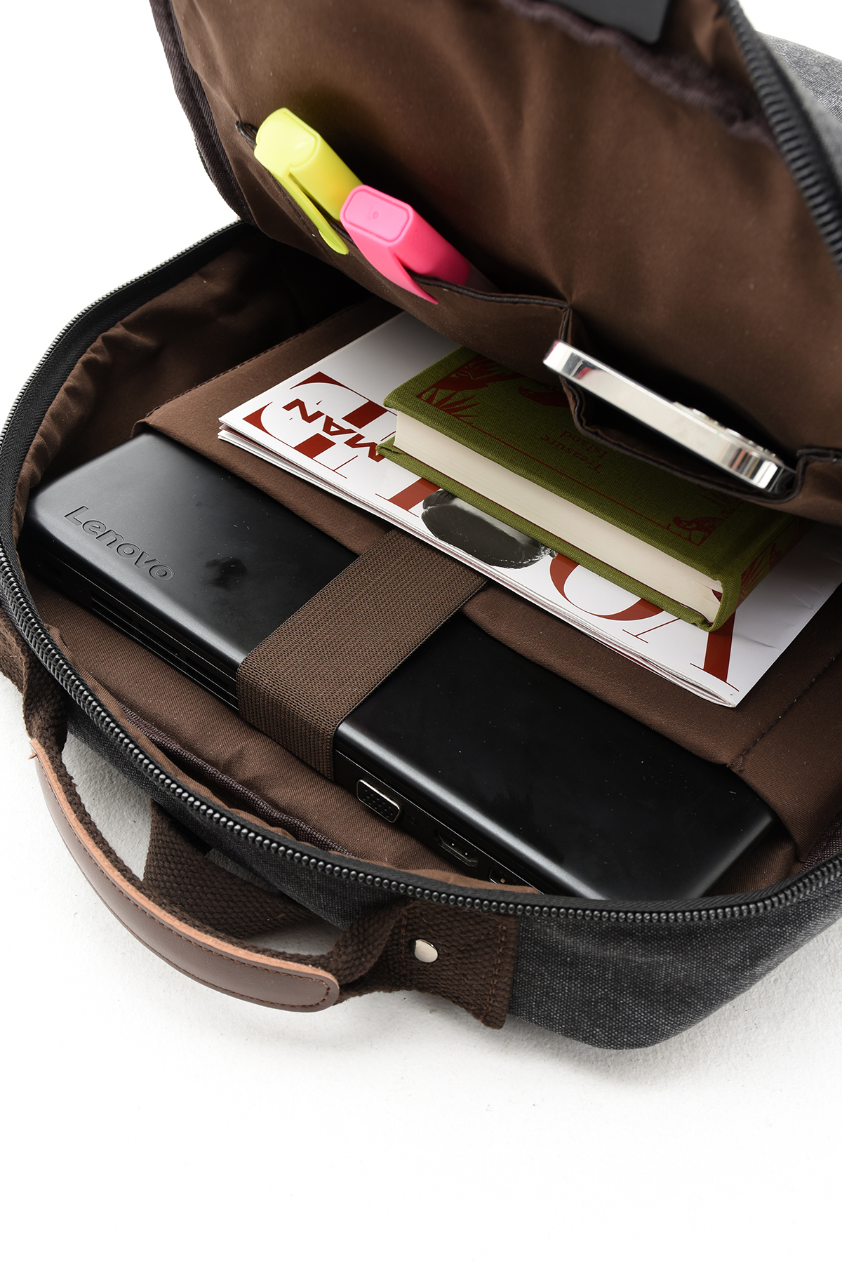 بندهای شانه قابل تنظیم. ویژگیهای داخلی: فضای داخلی آستر دارد. محفظه اصلی شامل دو جیب بدون زیپ و یک محفظه لپتاپ است.