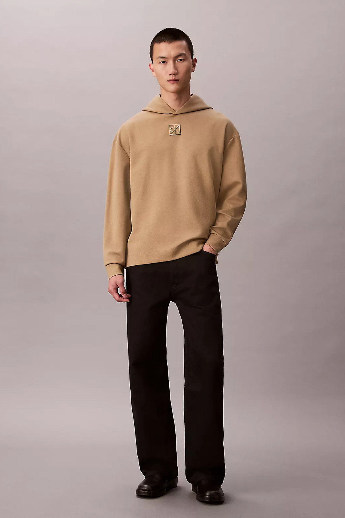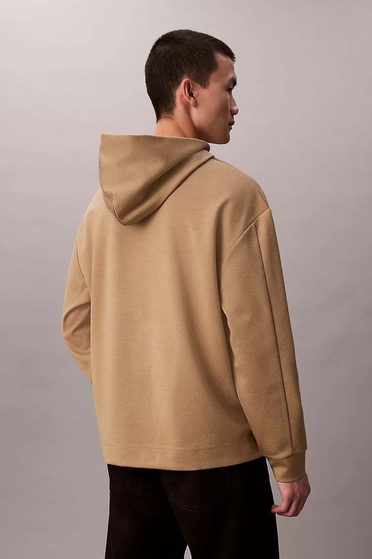 خرید اینترنتی سویشرت پشمی مردانه کلاهدار تمامعیار با جزئیات لوگوی مربعی – بژ برند کلوین کلاین Calvin Klein اورجینال از MarkaPlus نمایندگی و فروشگاه معتبر ترکیه