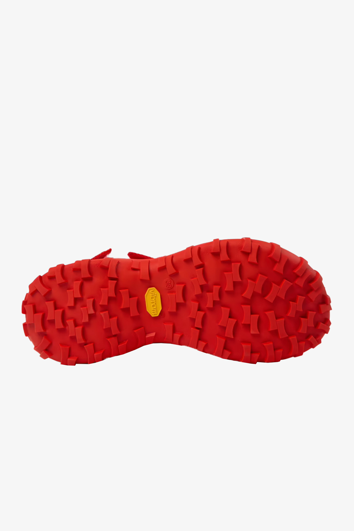 صندلهای زنانه چرم چند رنگ و PET بازیافتی دارای سیستم قلاب و حلقه، زیره میانی EVA و زیرههای Vibram هستند.