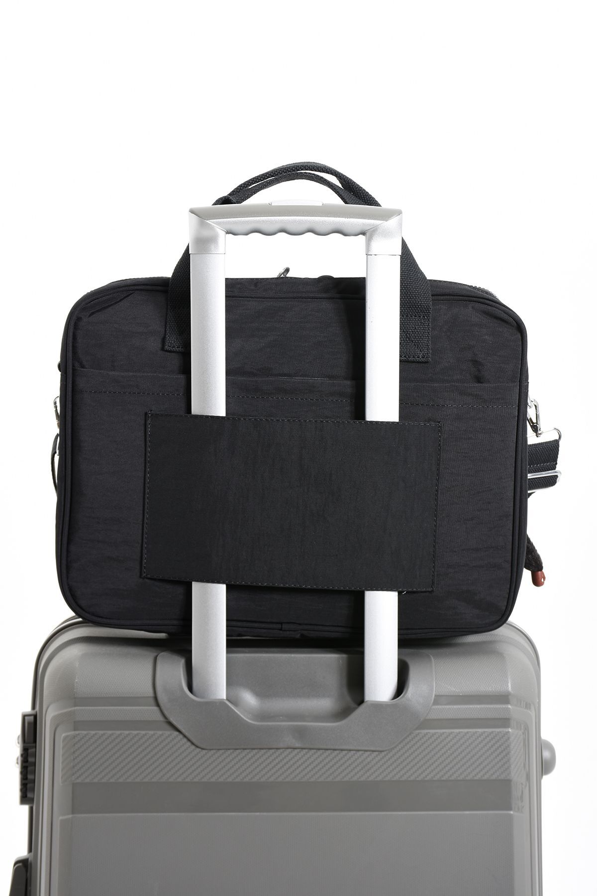 دارای بندی در پشت است که به راحتی میتوان آن را به یک چمدان چرخدار متصل کرد.