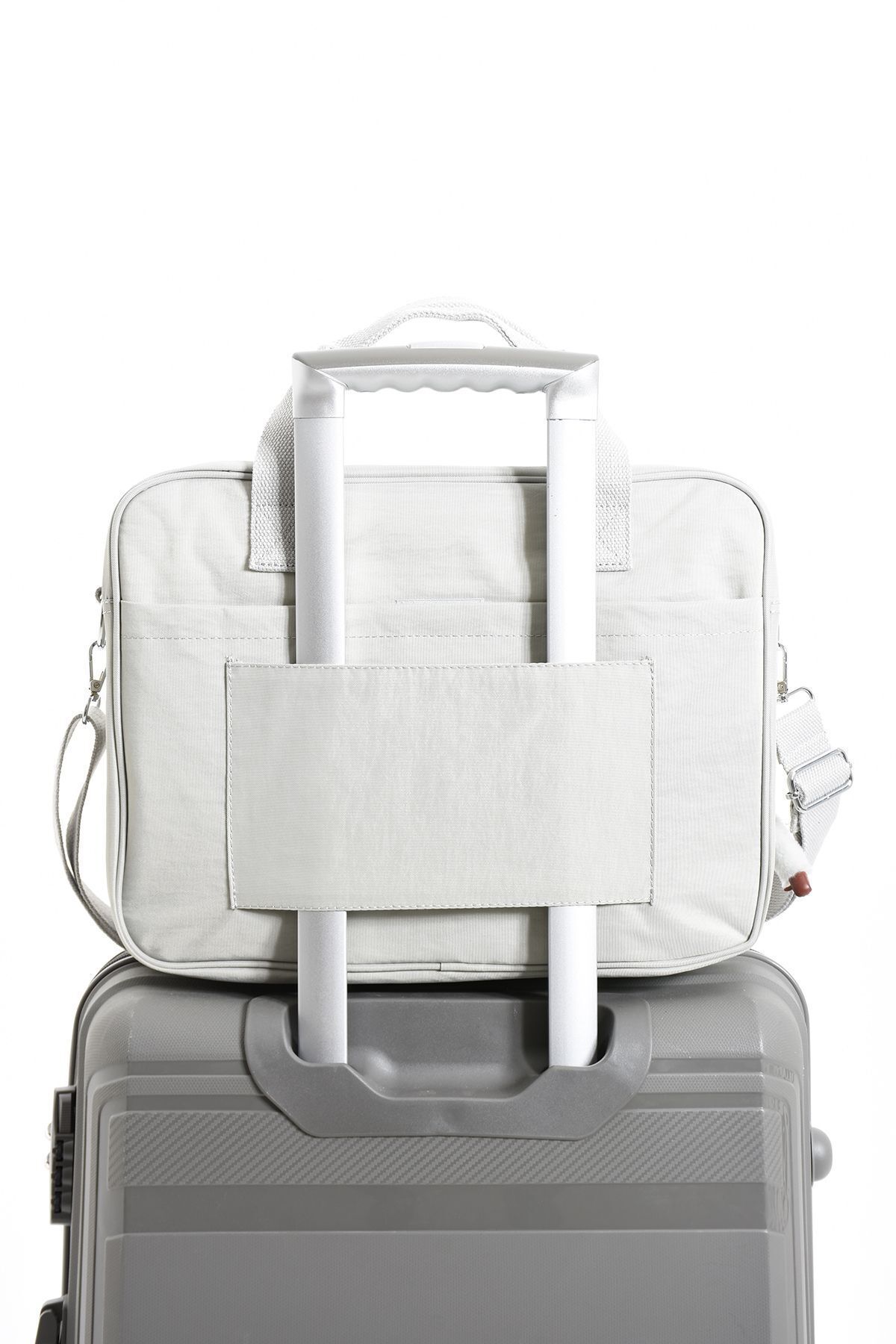 دارای بندی در پشت است که به راحتی میتوان آن را به یک چمدان چرخدار متصل کرد.