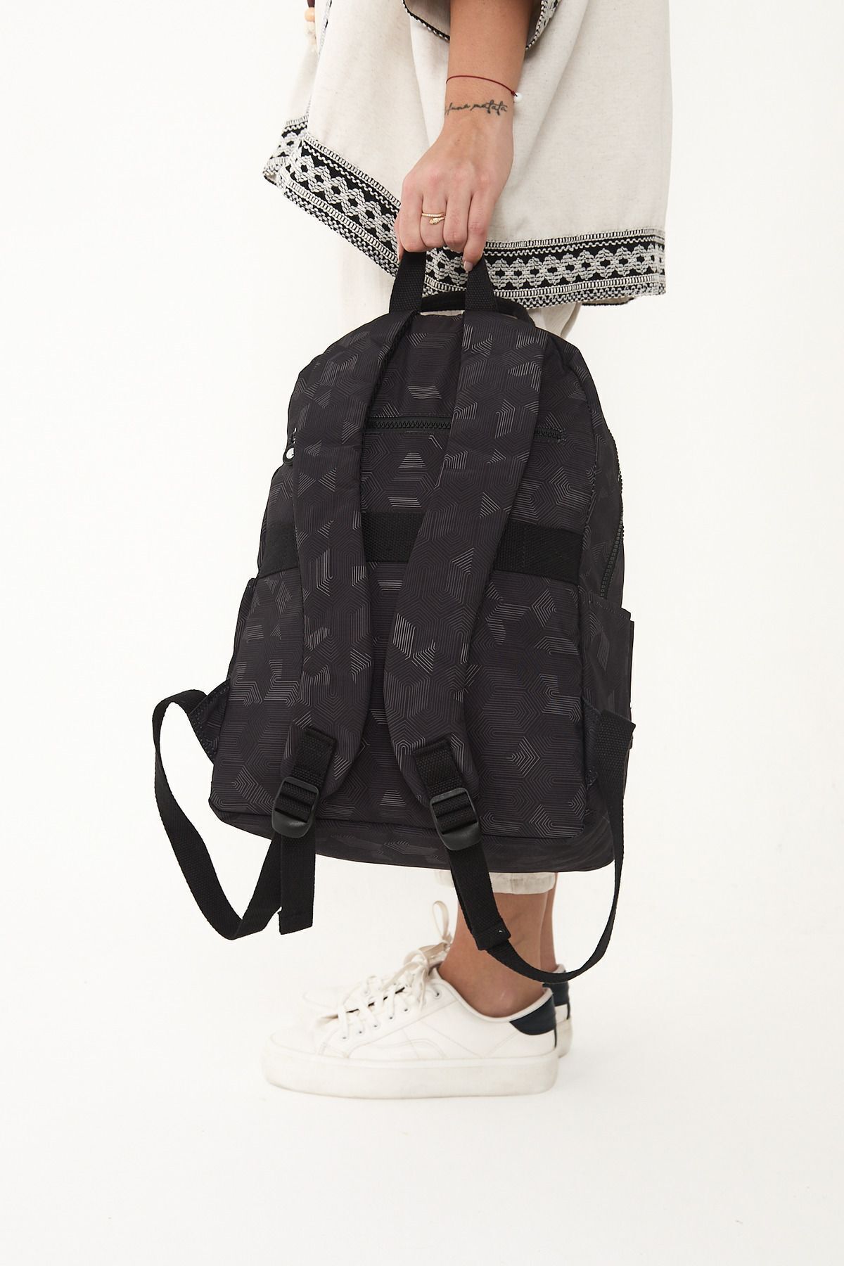 Tag: کوله پشتی لپ تاپ مدرسه و مسافرتی طرح دار مشکی، مقاوم در برابر آب، سایز متوسط، پارچه چروک، مناسب برای هر دو جنس زنانه