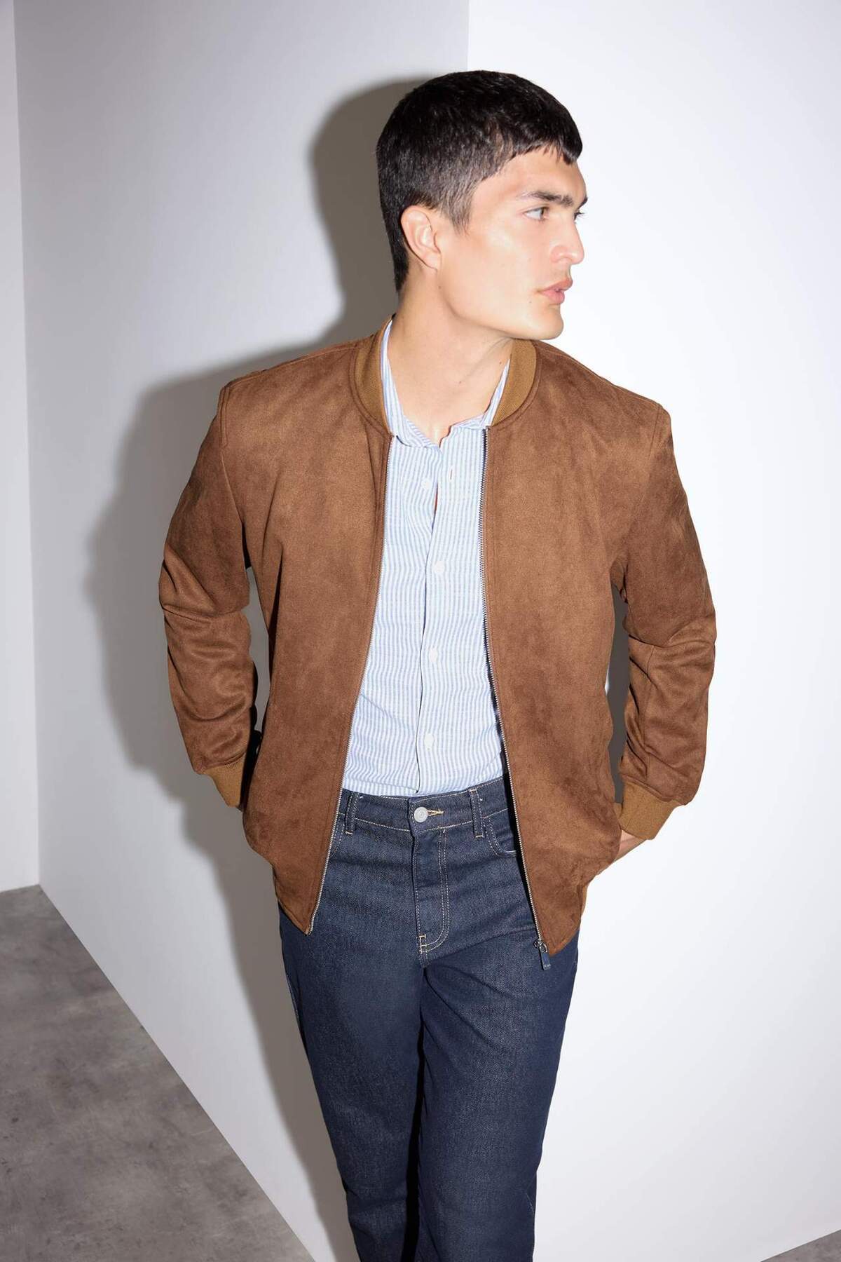 این ژاکت جیر با تناسب باریک و یقه دانشگاهی ظاهری مدرن و شیک ارائه می دهد.