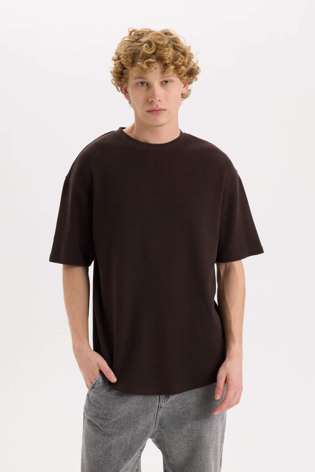 تی شرت وافل یقه کوتاه باکسی فیت استایلی مدرن و راحت ارائه می دهد.