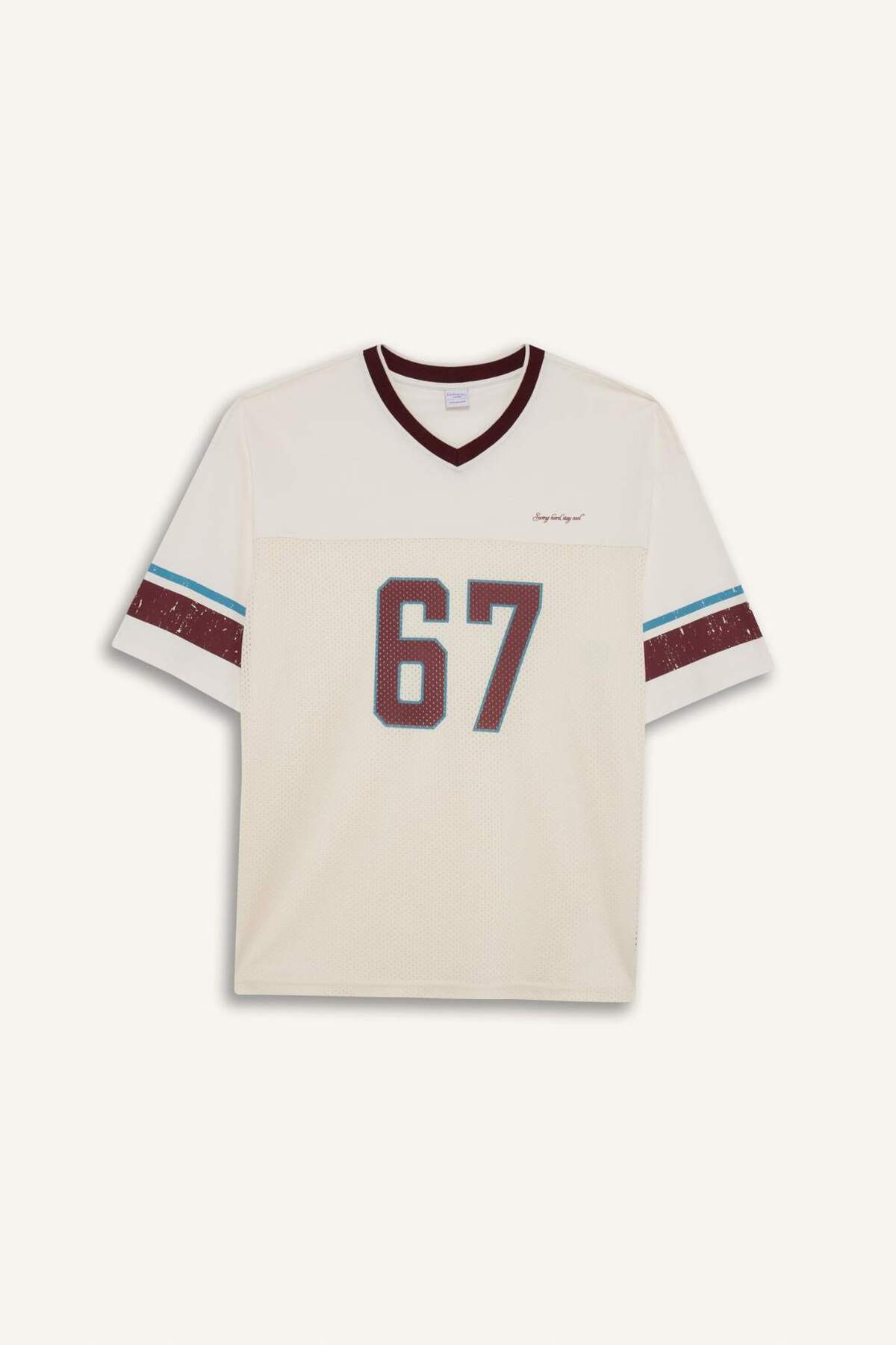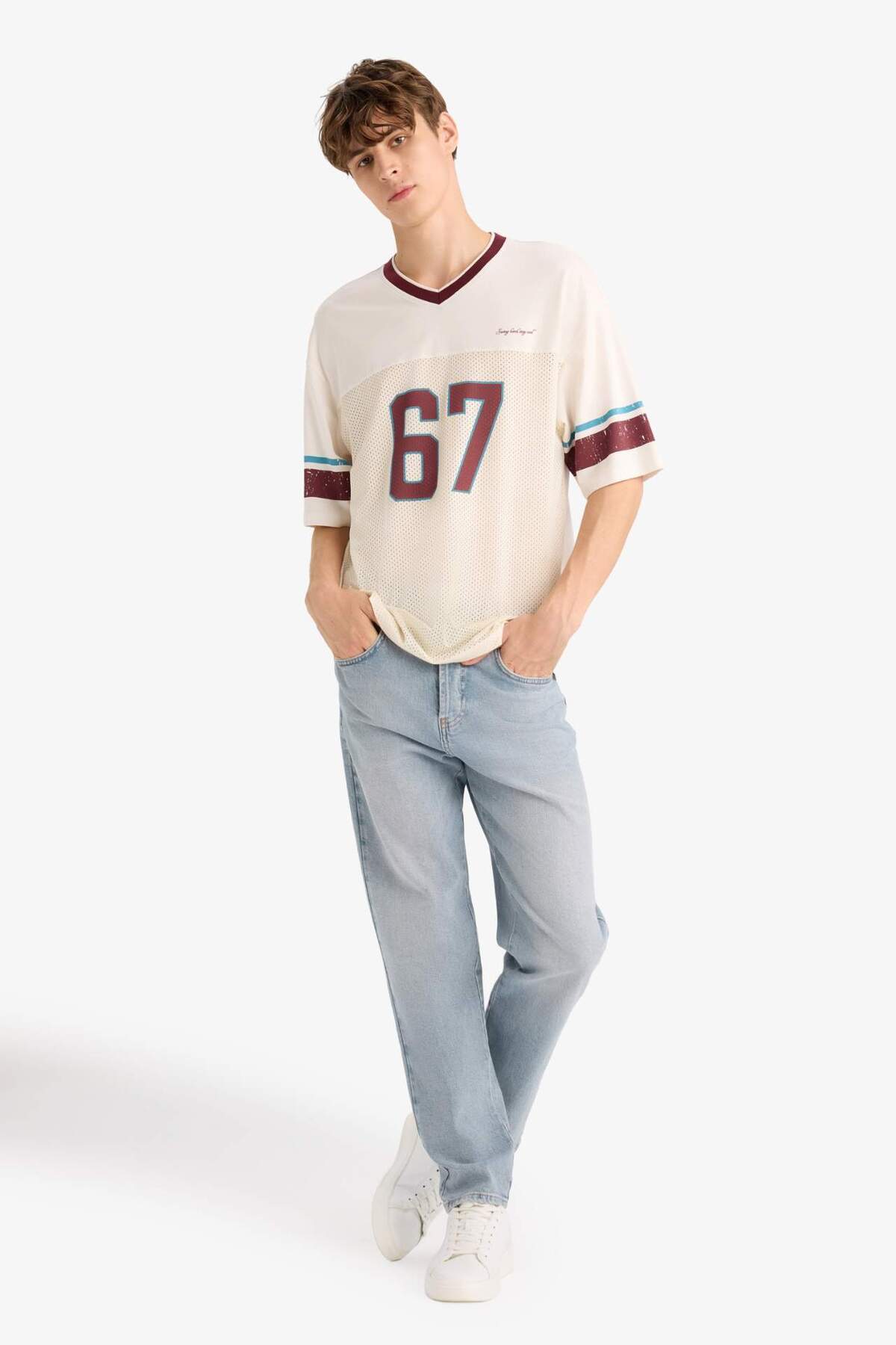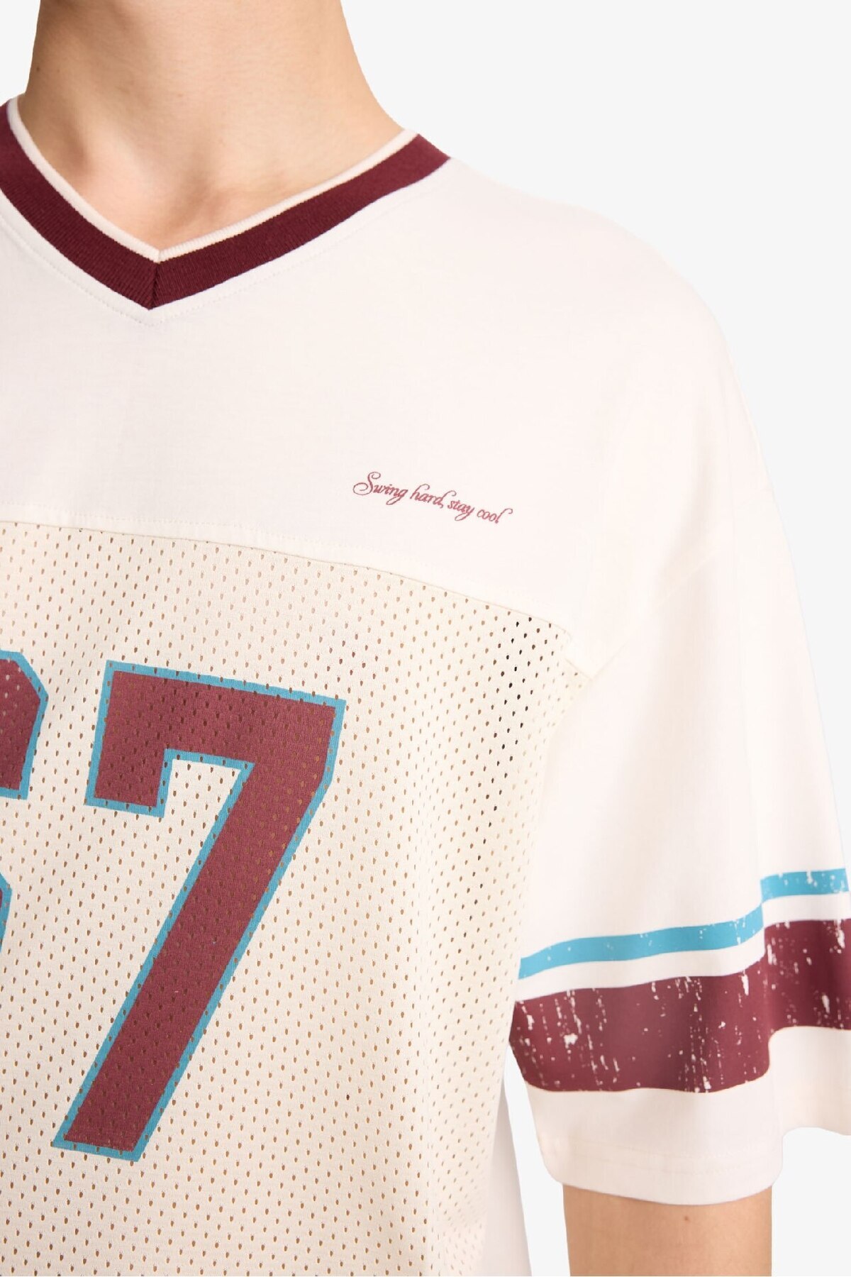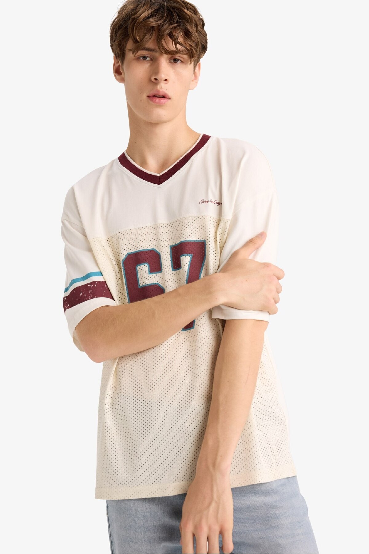 این تی شرت آستین کوتاه با چاپ یقه V شکل جعبه ای، راحتی و استایل را با تناسب گشاد و چاپ پر جنب و جوش خود ترکیب می کند.